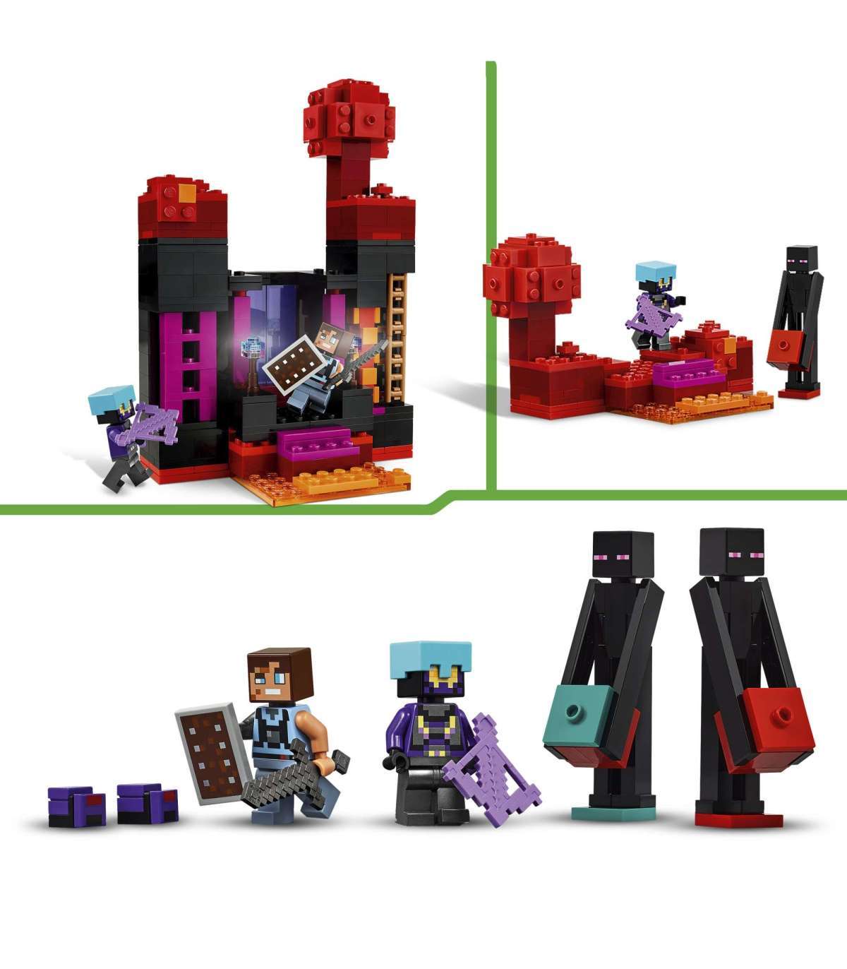 • Kogutavad videomängufiguurid – komplektis on dimensioonide kaitsja, kuningriigi rüüstaja, kaks Lõpumehe minifiguuri ja kaks endermiidi figuuri, nõiutud amb ning neteriidist mõõk ja kilp