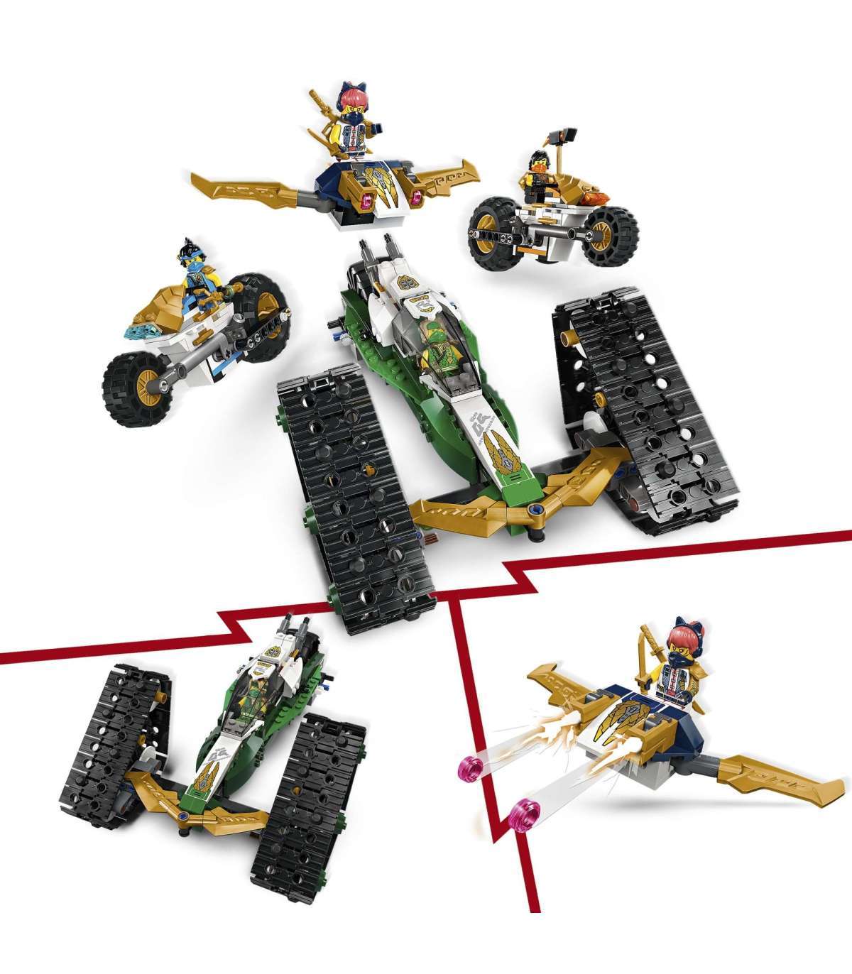 • Eemaldatavad ninjasõidukid – suure NINJAGO® sõidukisaab jagada neljaks väiksemaks sõidukiks: Sora purilennuk kahe nupsukahuriga, Lloydi maastikusõitja ning Cole'i ja Nya mootorrattad