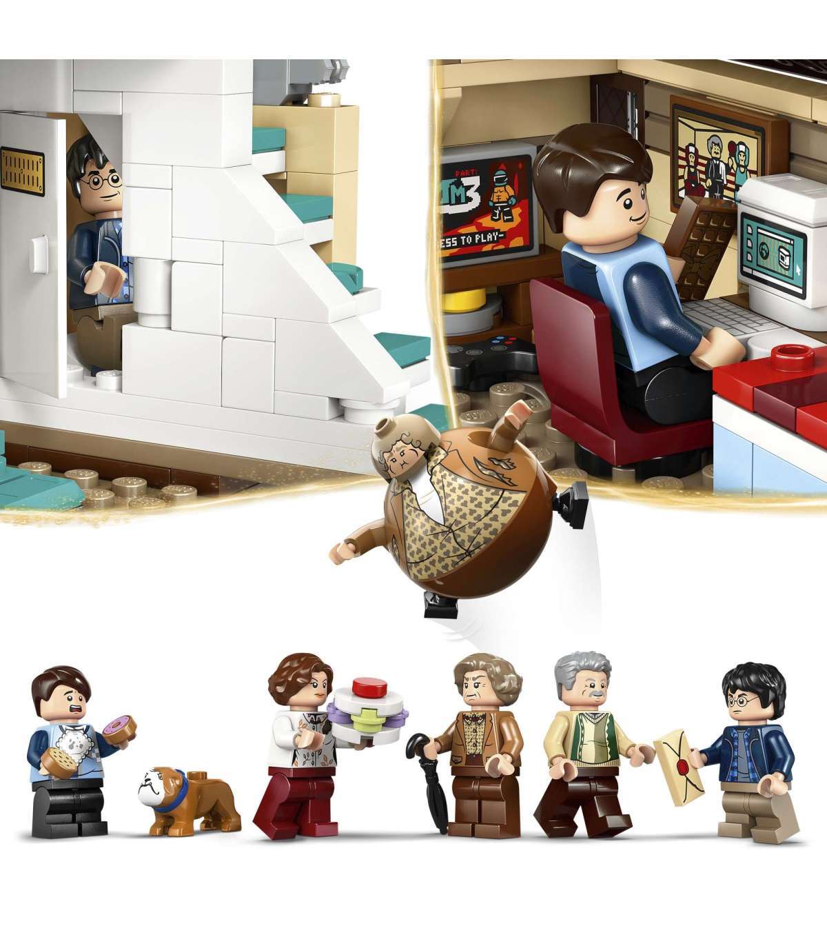 • 5 LEGO® Harry Potter™ minifiguuri – Marge Dursley, Vernon Dursley, Petunia Dursley, Dudley Dursley, Harry Potter™, lisaks täispuhutud tädi Margeʼi figuur ja Rappija koerafiguur