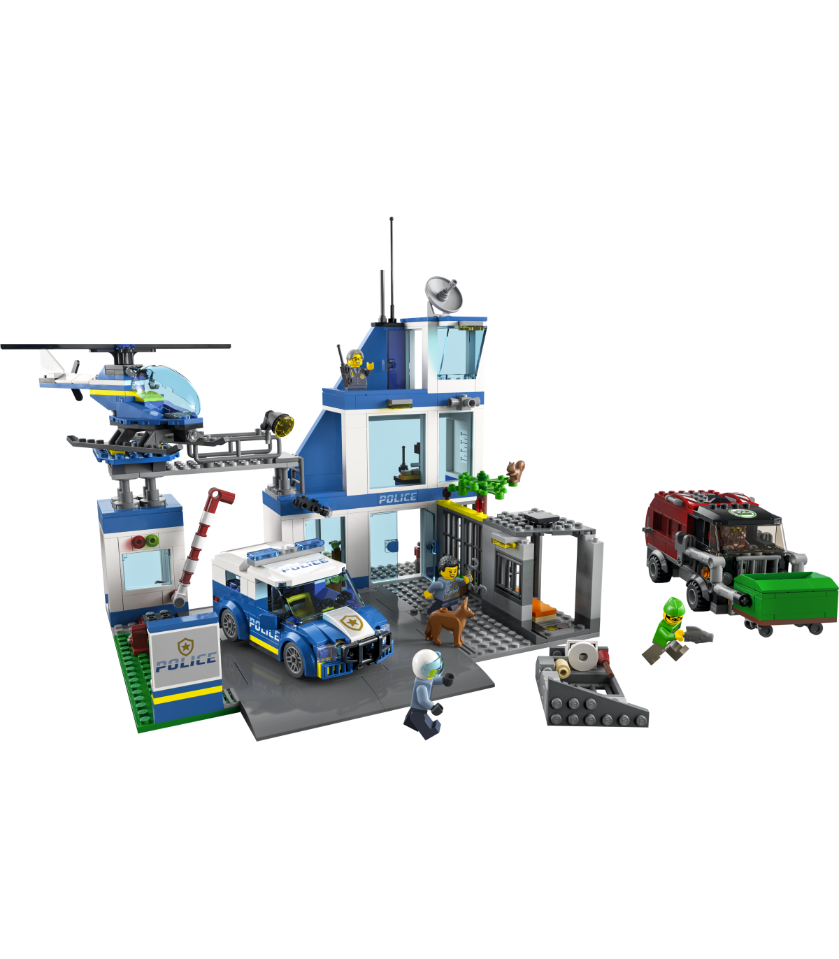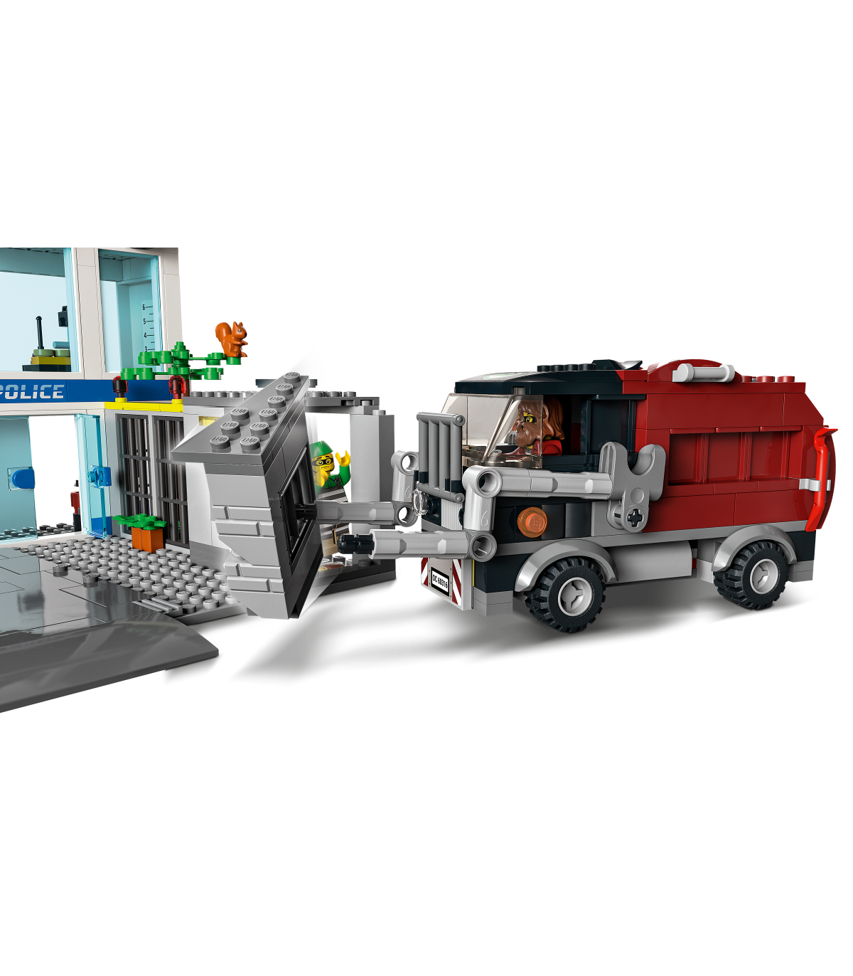 Detailid ja funktsioonid – prügiveoautol on konteinertõstuk ja kaks rammi, et lõhkuda hõlpsalt purustatav vangikongi sein. Komplektis on ka teeplaat teiste LEGO® City komplektidega ühendamiseks