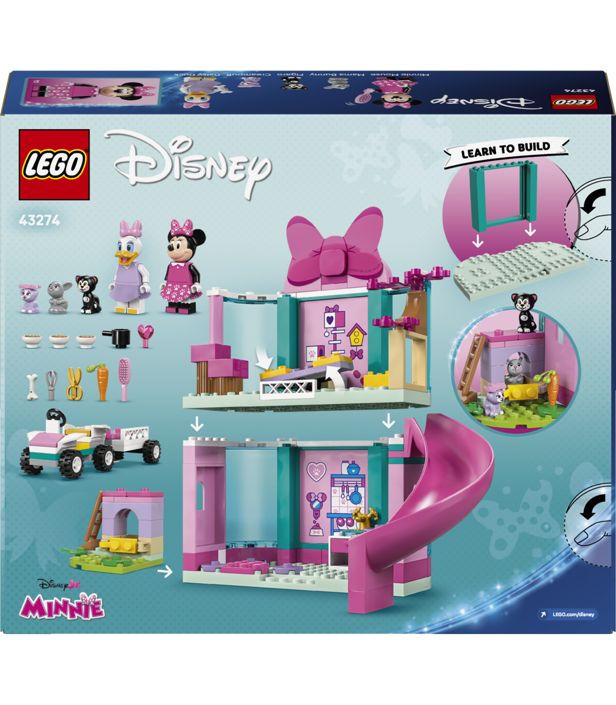 • Mis on karbis – selles LEGO® ǀ Disney ehituskomplektis on modulaarne lemmikloomahotell, kus on liumägi, mänguköök ja jänkupuur, lisaks auto, haagis, 2 LEGO ǀ Disney minifiguuri ja 3 LEGO ǀ Disney lemmikloomategelast