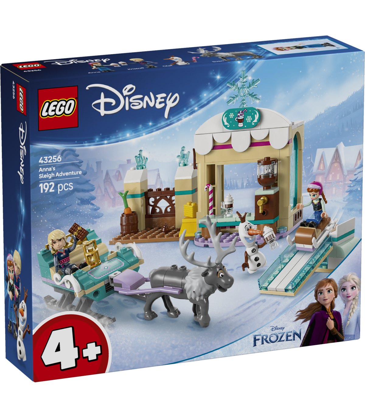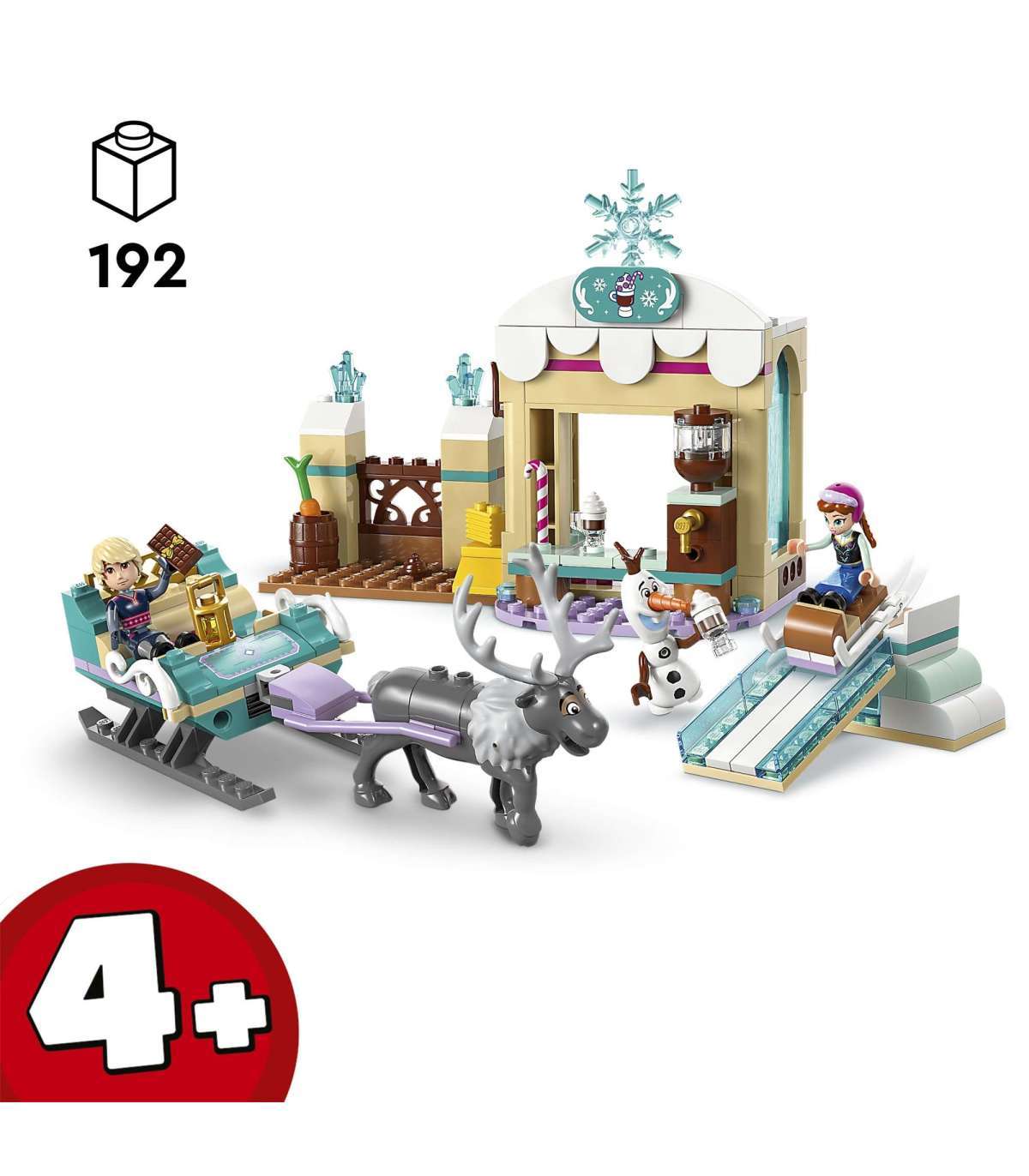 • Ehitusmudelikomplekt – kelk, kuuma šokolaadi kiosk, tall, Anna ja Kristoffi LEGO® ǀ Disney Frozeni mininukufiguurid, Olafi LEGO ǀ Disney lumememmefiguur ja Sveni LEGO ǀ Disney põhjapõdrafiguur