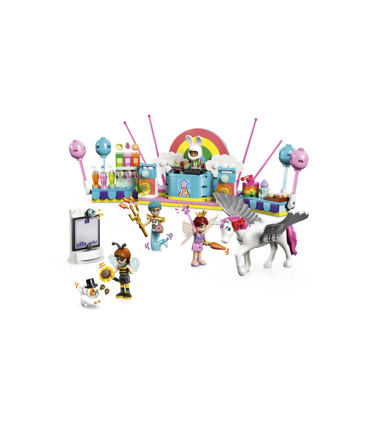 • Kostüümipeo tarvikud – selle LEGO® mänguasjaga on kaasas palju tarvikuid, mis innustavad rollimängu, sealhulgas jääjoogimasin, koogid, joogid, õhupallid, mütsid, merimehe kolmhark, haldja võlukepp ja palju muud
