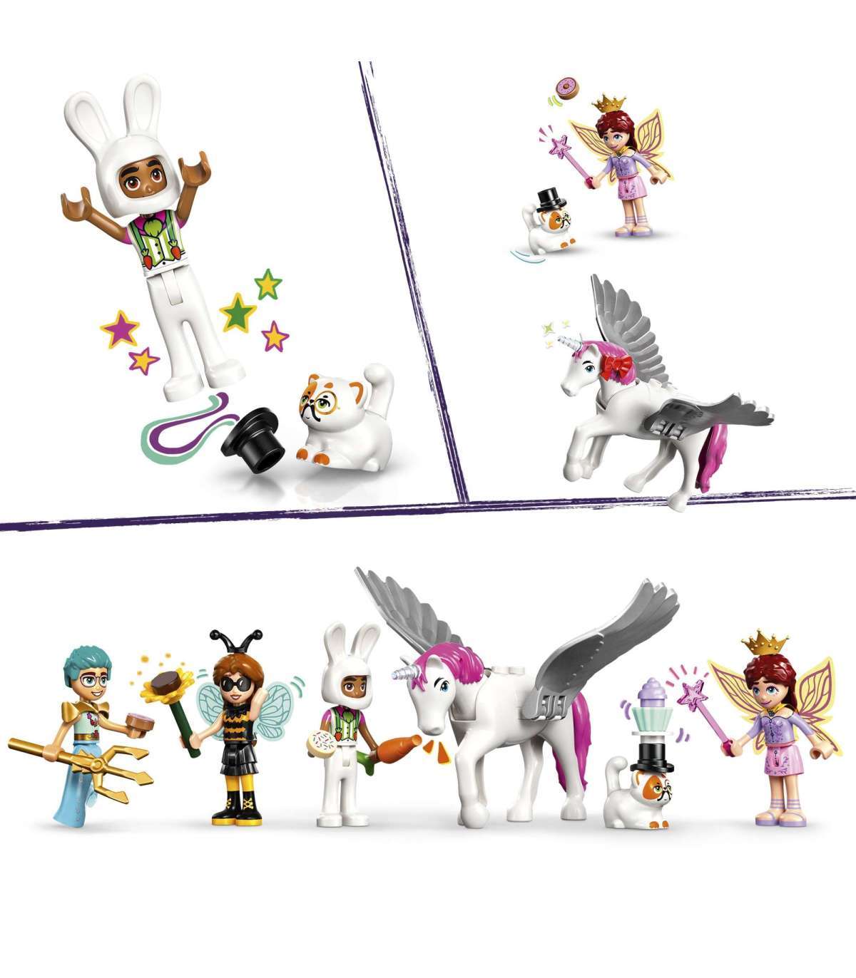 • 4 mininukku ja 2 LEGO® loomafiguuri –alusta pidu koos Autumni, Olly, Leo, Paisley ja nende lemmikloomadega, kui nad riietuvad mesilaseks, merimeheks, mustkunstnikuks, jänkuks, haldjaks ja ükssarvikuks