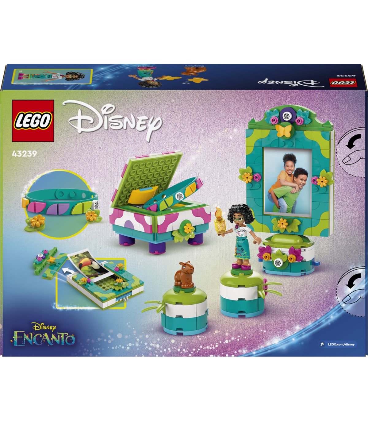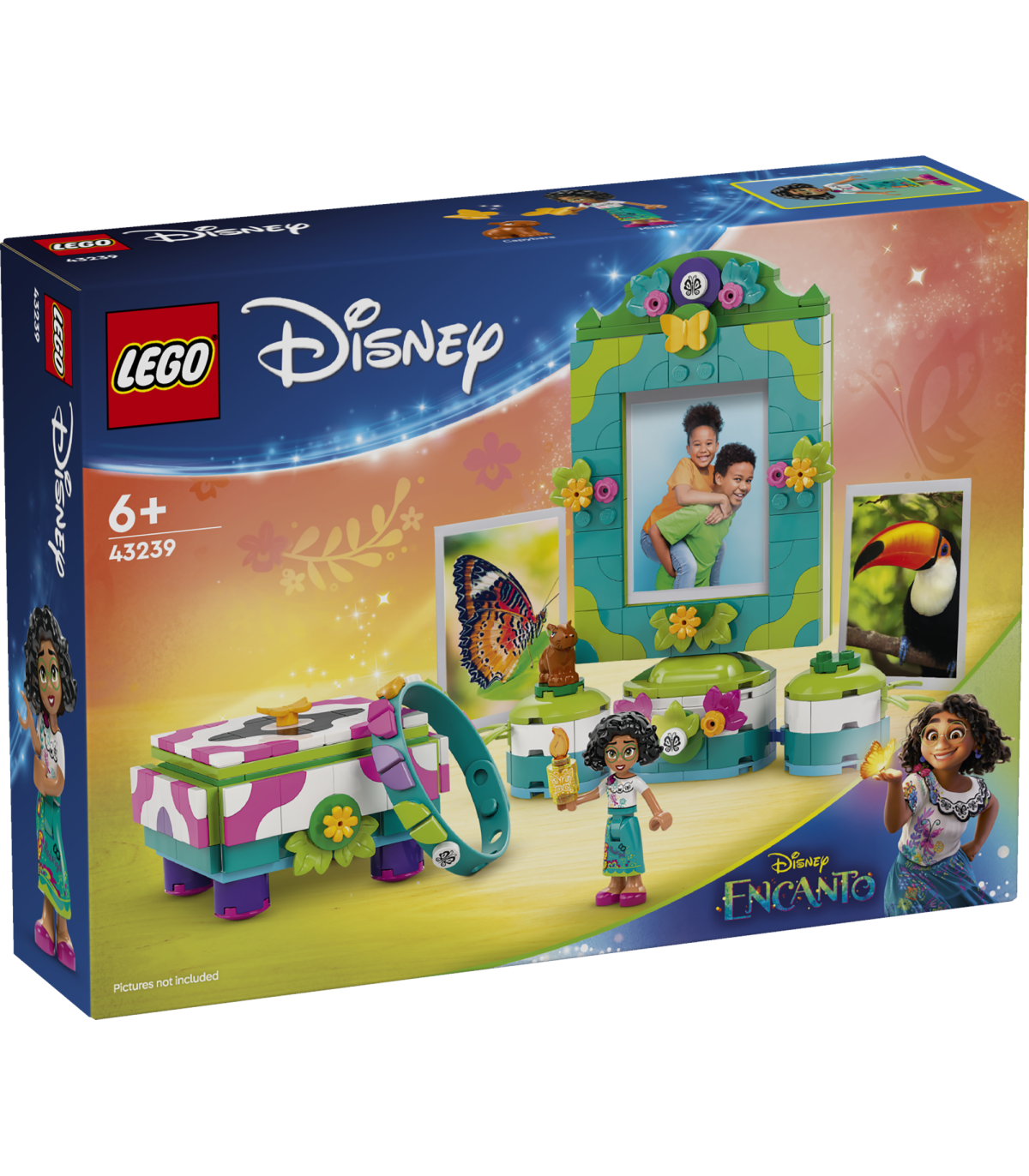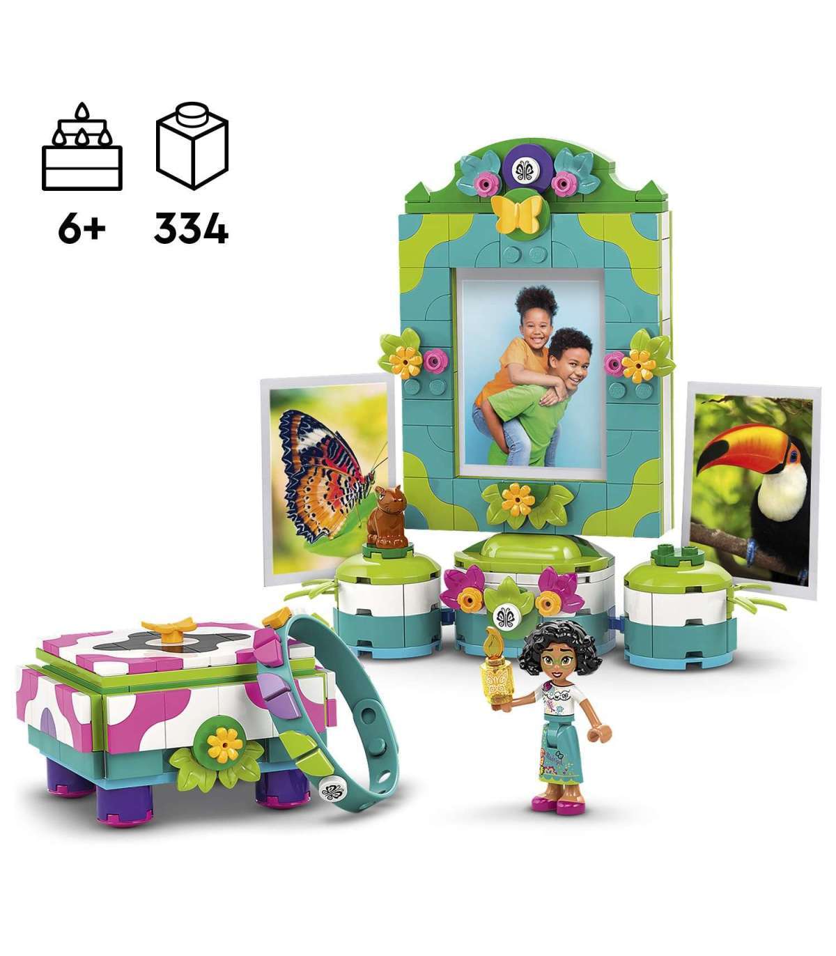 • LEGO® pildiraam – kokkupandav komplekt sisaldab väikest ehtekarpi, alusega pildiraami ja lisaklambreid, kantavat käevõru ning Mirabeli LEGO® ǀ Disney Encanto mininukufiguuri