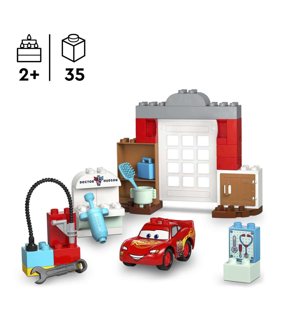 • Ehituskomplekt väikesele Autode fännile – koolieelikud mängivad mehaanikuid kokkupandava komplektiga LEGO® DUPLO® │ Disney ja Pixari Autod McQueeni külaskäik Doci garaaži