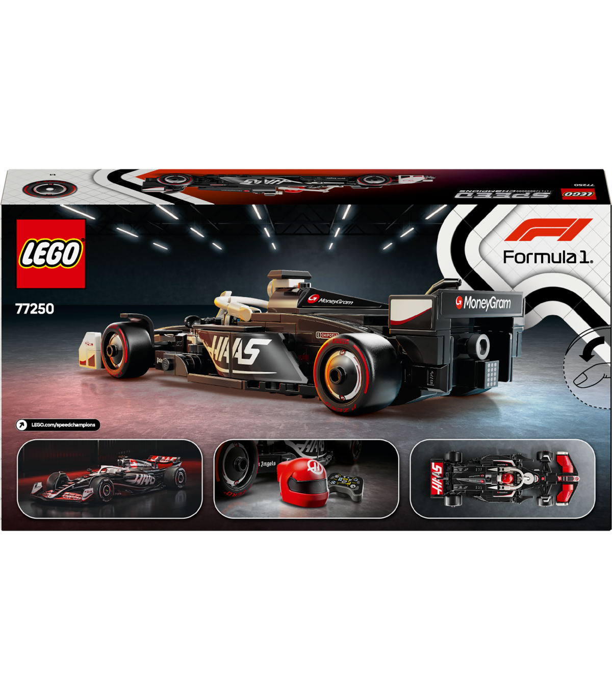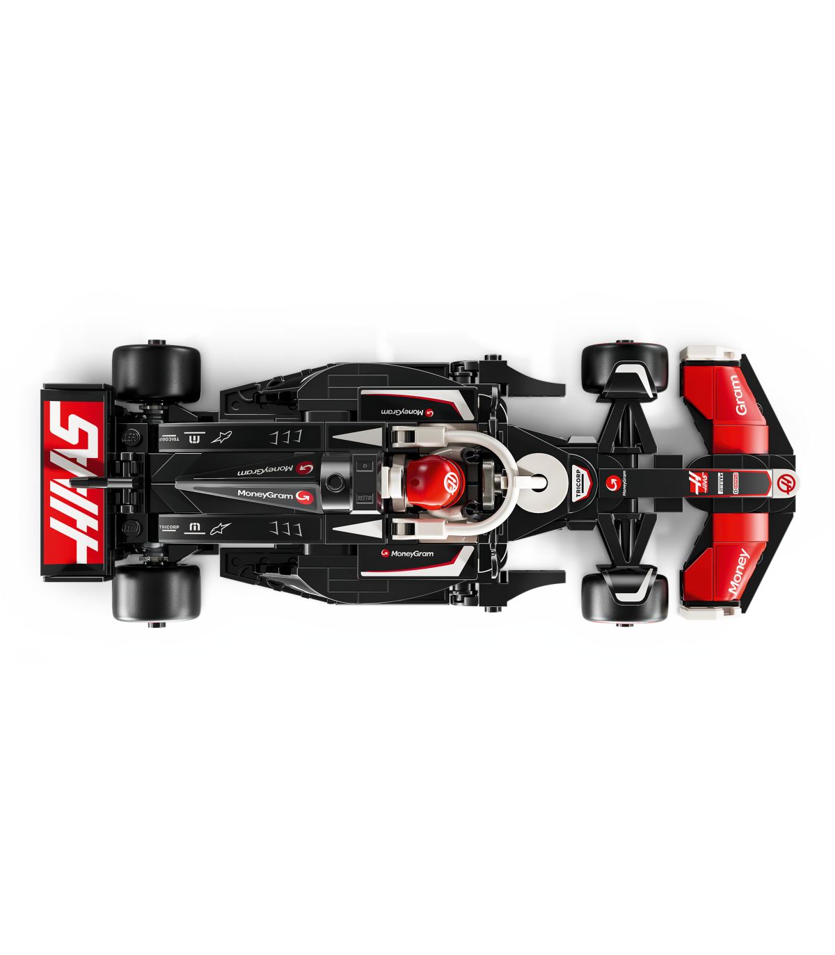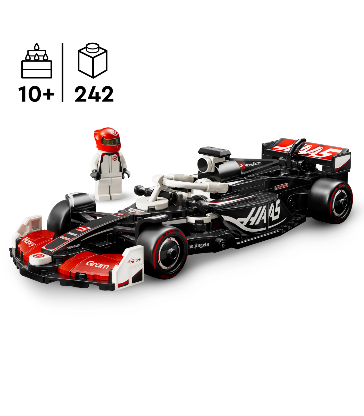• 1 minifiguur – sõidukikomplektis on juhi minifiguur, kes kannab MoneyGram Haas F1 Teami riietust ja kiivrit, et lapsed saaksid selle kokpitti paigutada ja rollimängu etendada