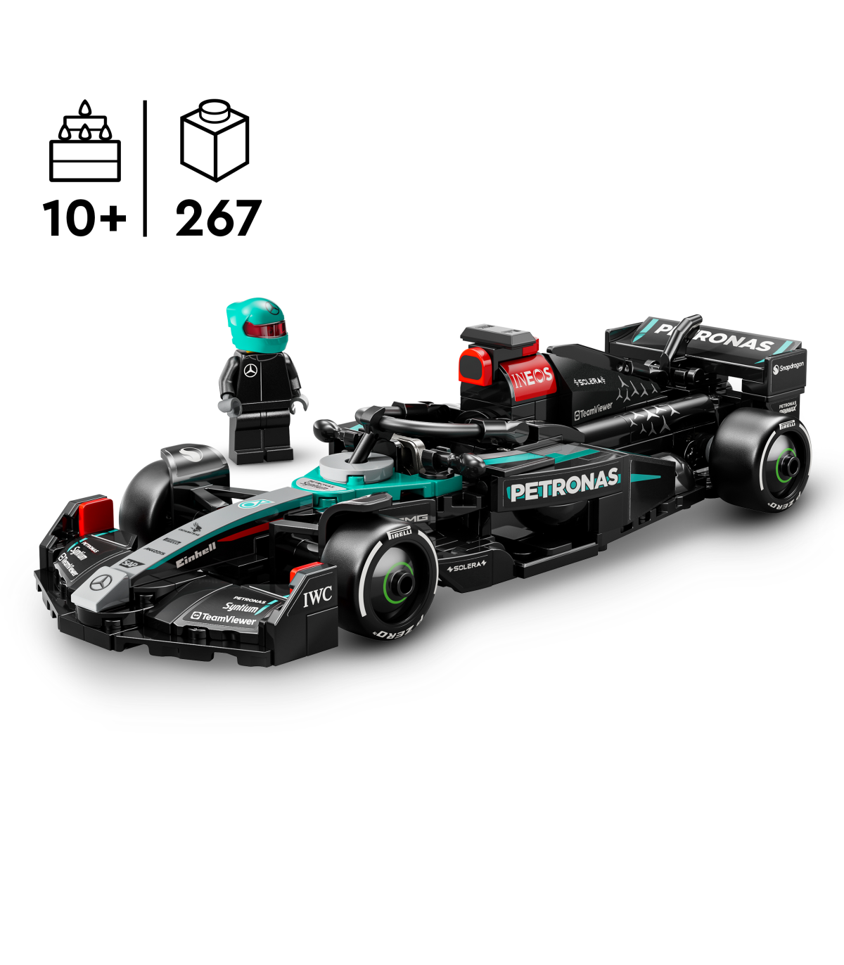 • 1 juhi minifiguur – see automängukomplekt sisaldab Mercedes-AMG PETRONAS F1® meeskonna riietust kandvat juhi minifiguuri ja kiivrit, kelle lapsed saavad rollimänguks kokpitti paigutada