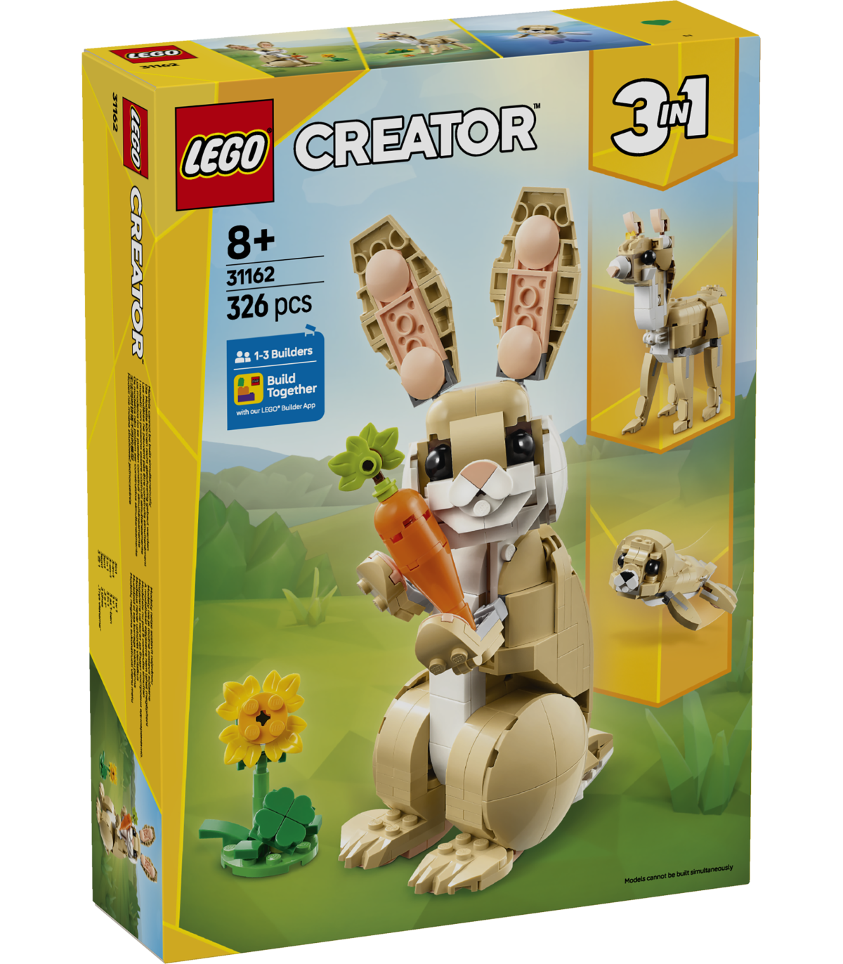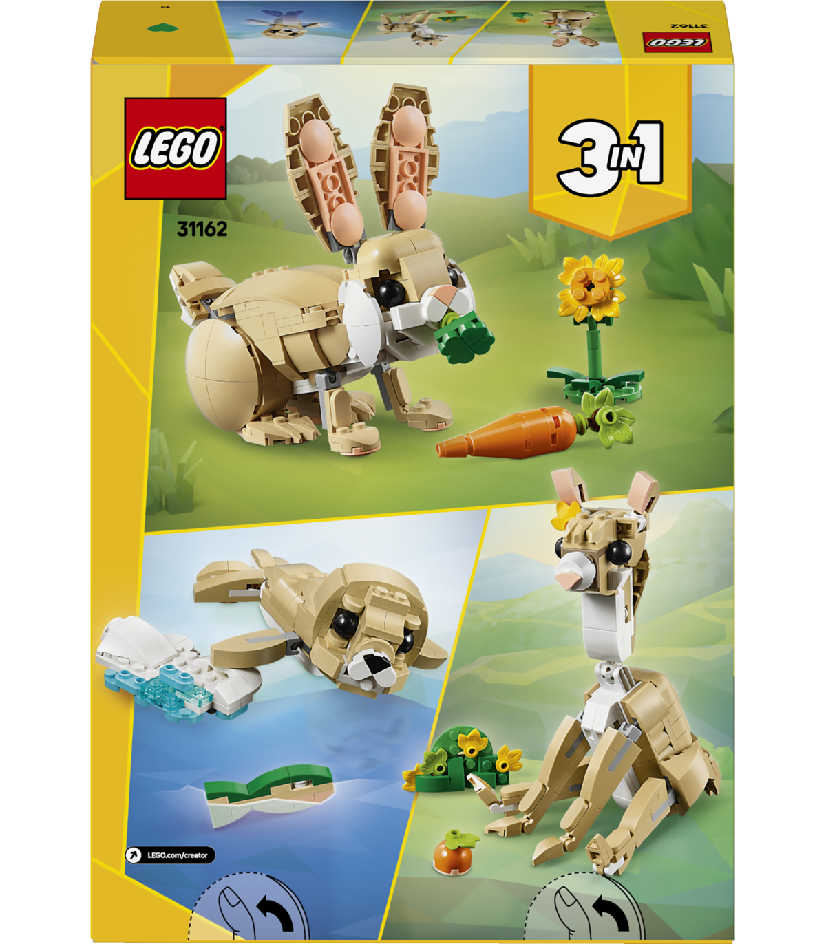 • 3 ümberehitatavat loomamängukomplekti lastele ühes karbis – LEGO® Creator armas jänku võimaldab vähemalt 8-aastastel tüdrukutel ja poistel samade klotsidega ehitada ja ümber ehitada 3 erinevat loomafiguuri