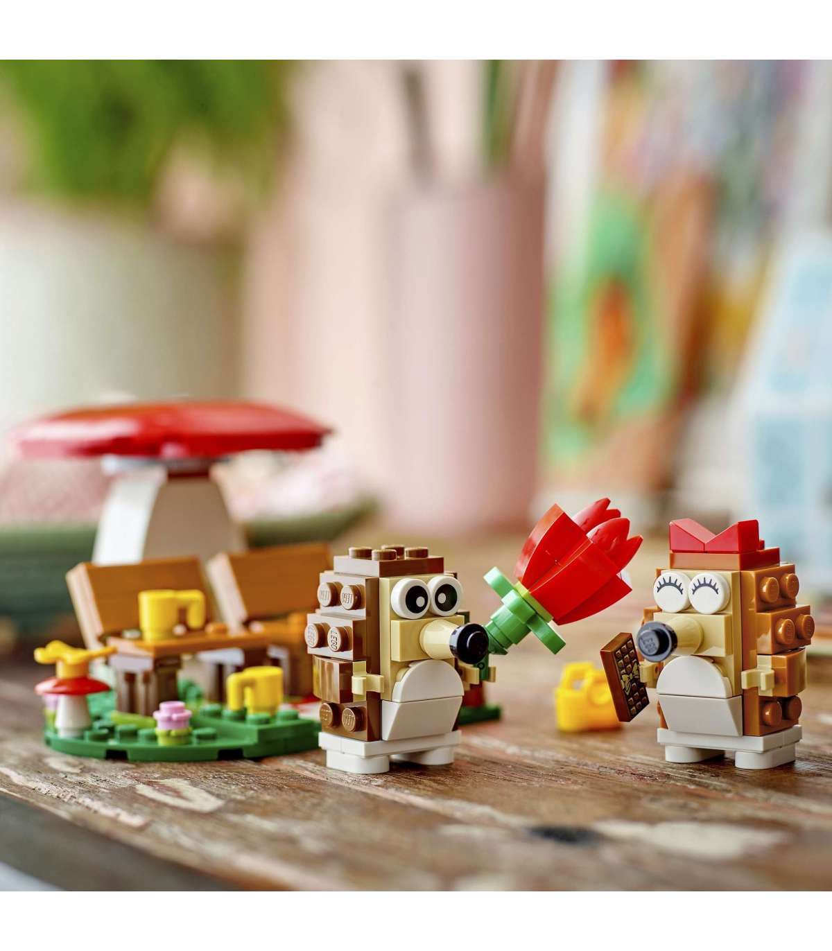 • Mängukomplekt armastuse tähistamiseks – kaks siili kohtingul istuvad südamekujulise seene all südamekujulisel alusel