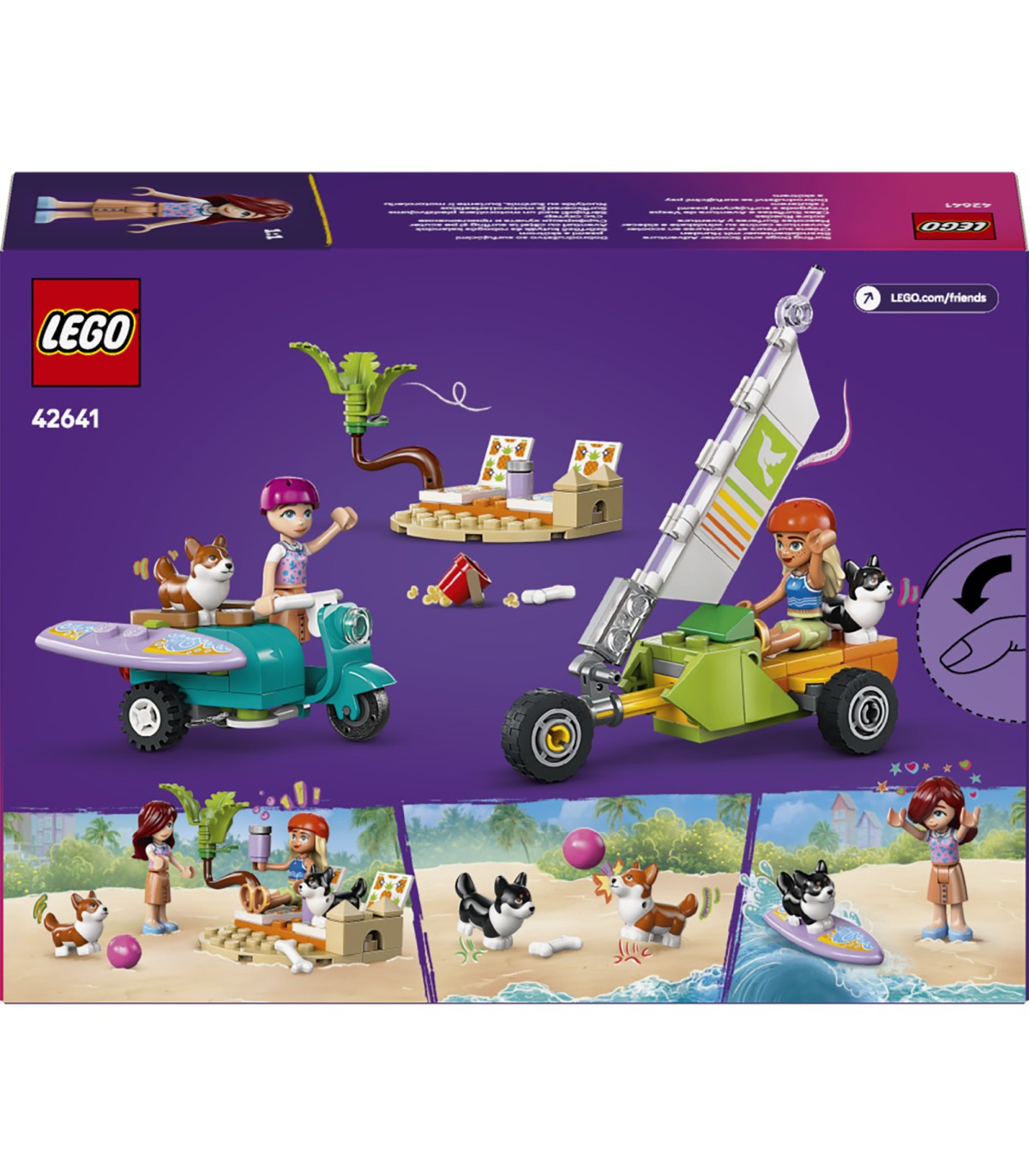 • 2 LEGO® sõidukit – komplektiga on kaasas kokkupandav motoroller ja kokkupandav maajaht, millest igaühes on ruumi mininukule ja koerafiguurile, lisaks väike surfilaua tarvik, millega corgid saavad sõita