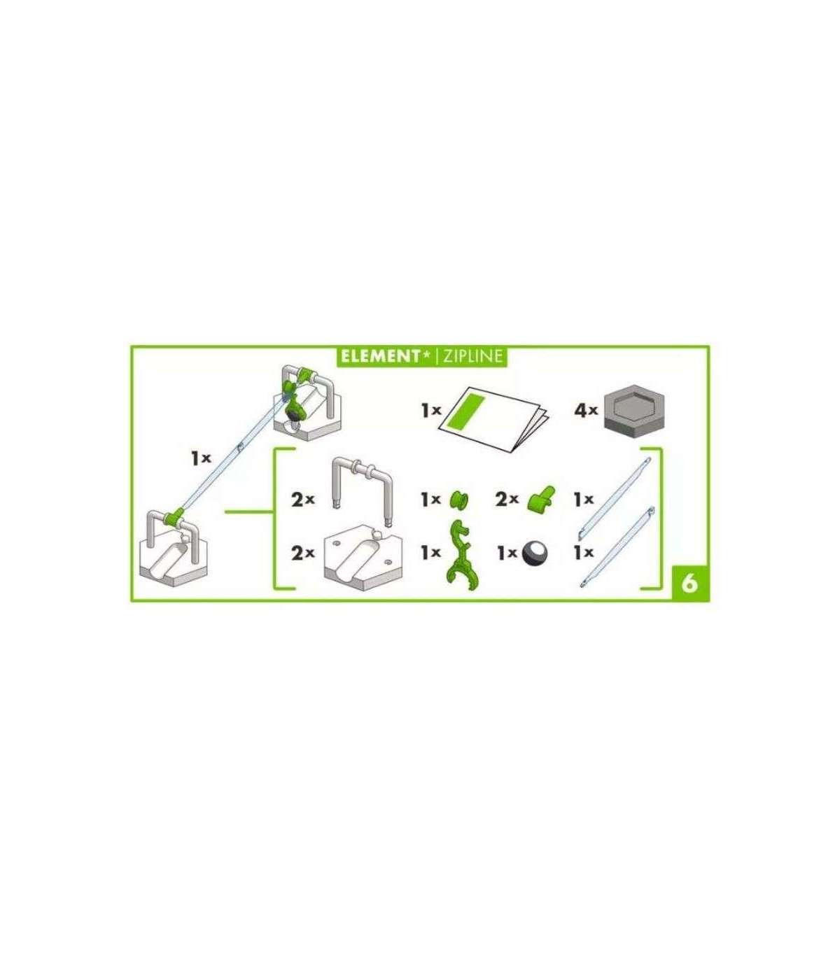 Mängukarp sisaldab: 4x ehitusklotsi, 2x U kujuline tugipost, 2x alusklots, liugratas, liughoob, 2x liugtala kinnitus, 2x liugtala ja juhend.