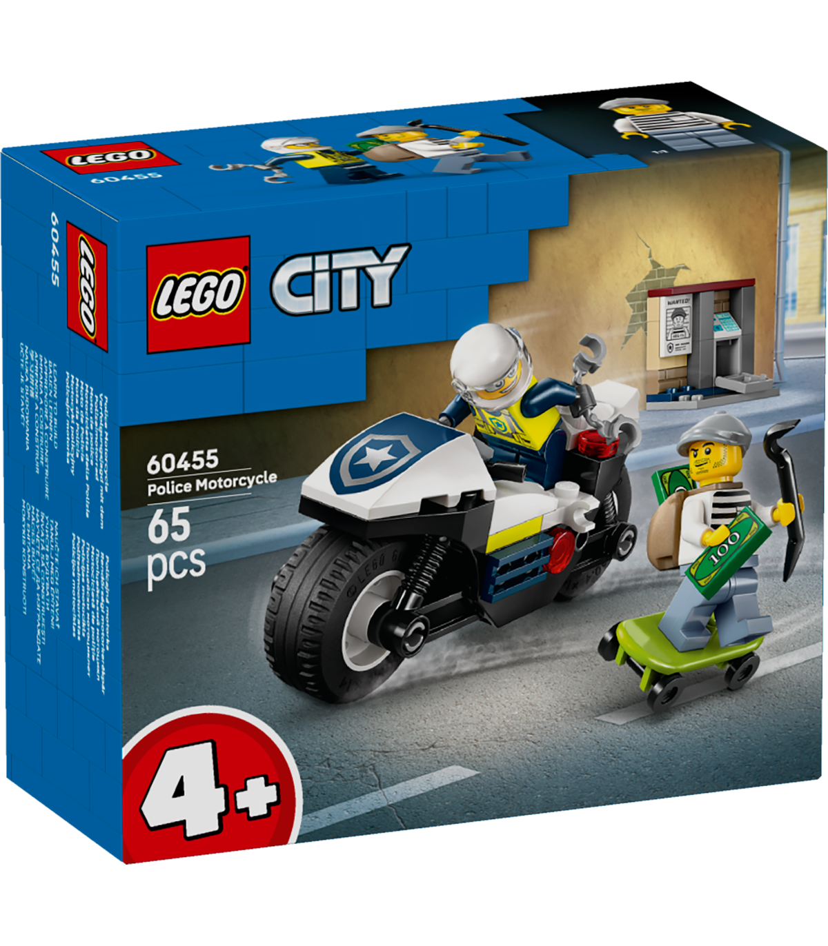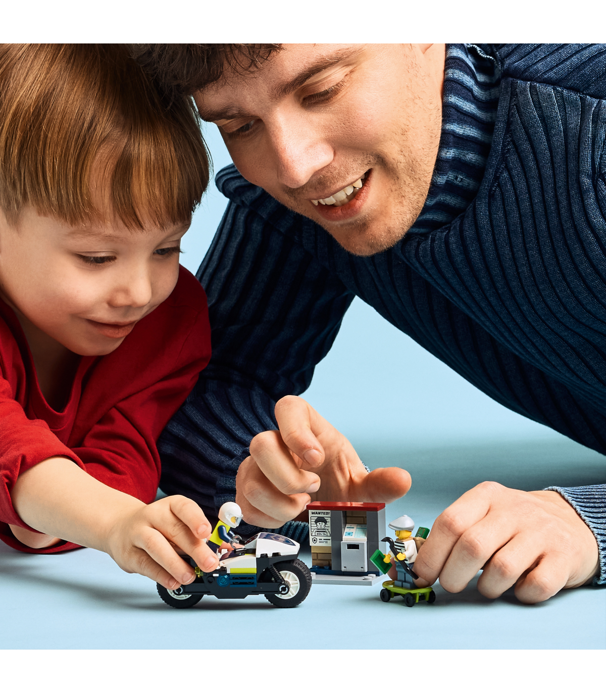• Politseimootorratta mänguasi alates 4-aastastele lastele – tutvusta oma väiksele kangelasele loomingulist mängumaailma selle LEGO® City politseimootorratta tagaajamise mängukomplektiga