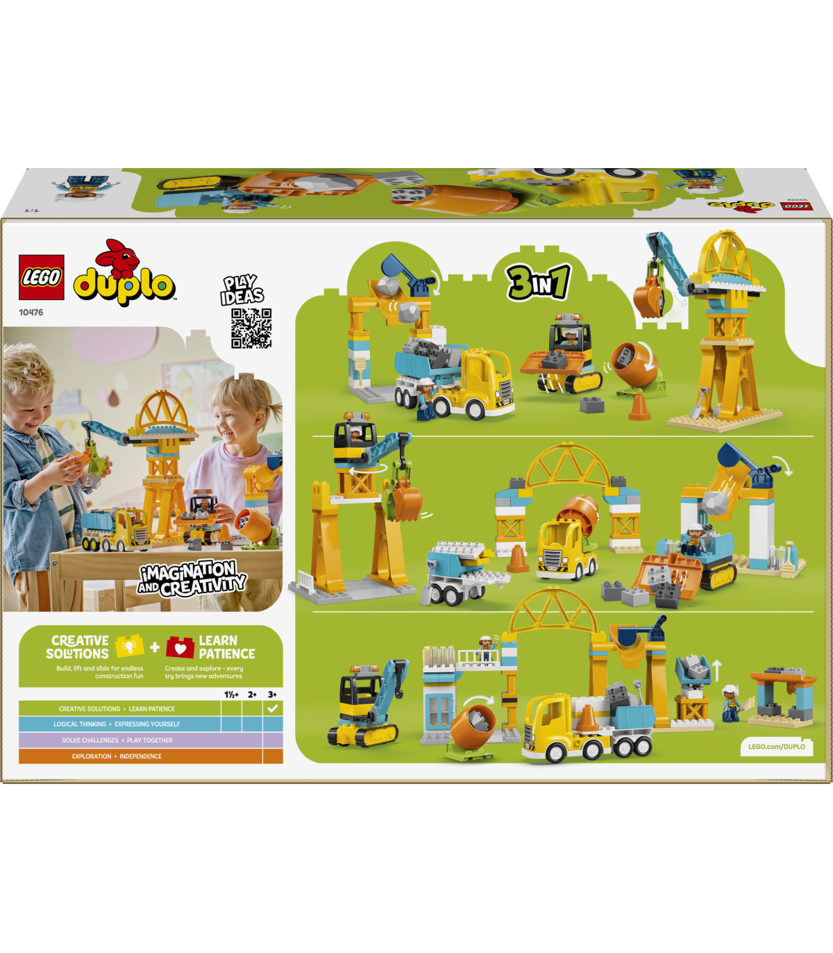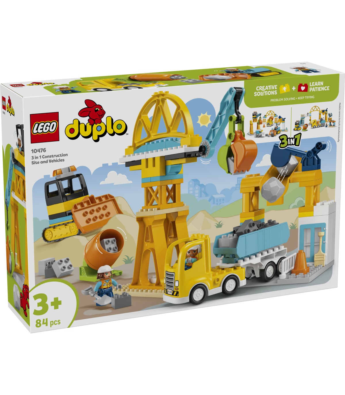 SUUR EHITUSMÄNGUASI VÄIKELASTELE – See kolm ühes ehitusplatsi ja -masinate (10476) komplekt sisaldab 2 figuuri ja 84 klotsi, millest saab ehitada hulga LEGO® DUPLO® linna veokimänguasju