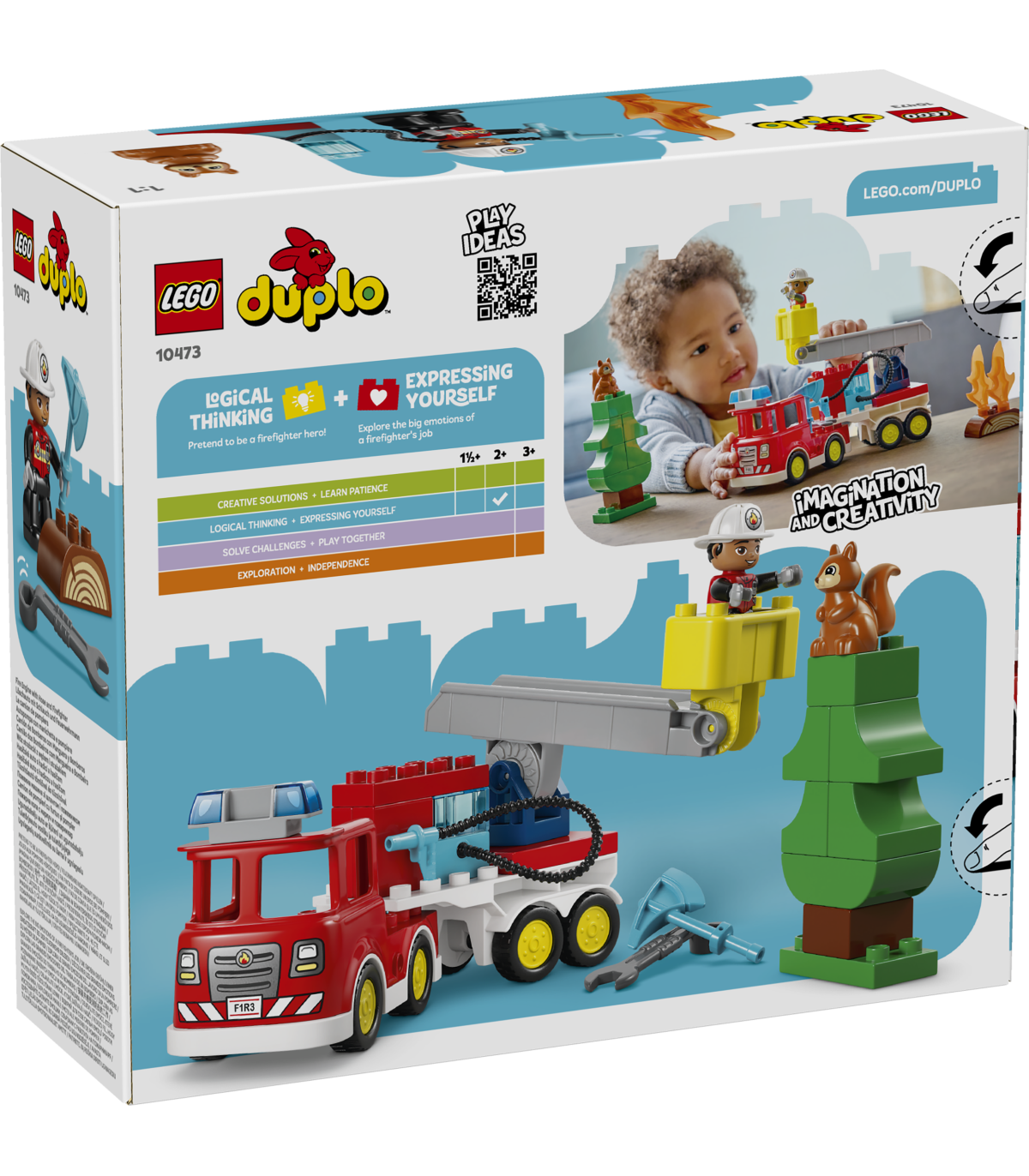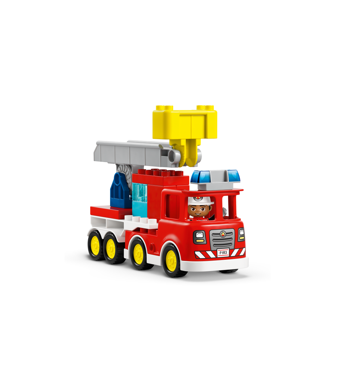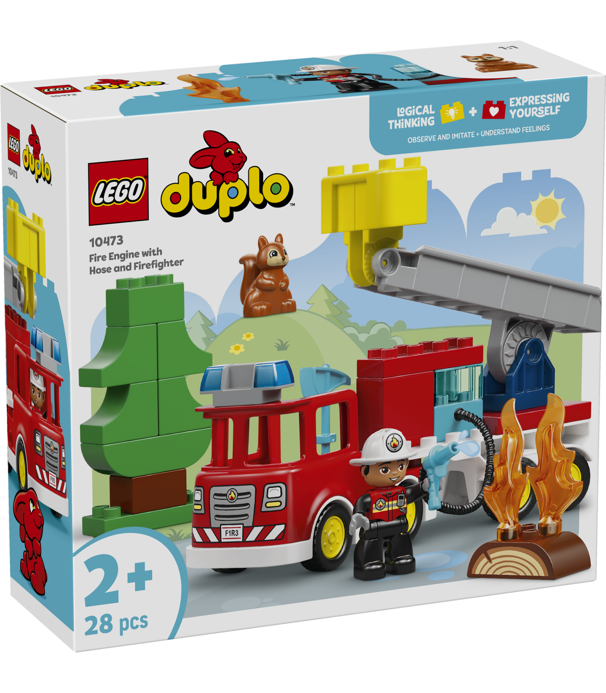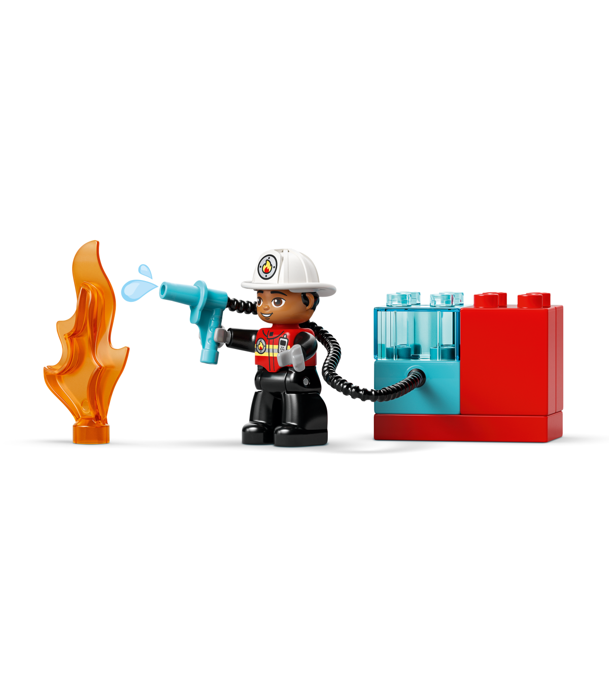 LEGO® DUPLO® tuletõrjuja mänguasi – See matkimismänguasi võimaldab väikelastel kujutleda, et nad on igapäevakangelased, kes kasutavad redelit, et kustutada põlevat palki voolikuga, kui orav jälgib tegevust kaugelt