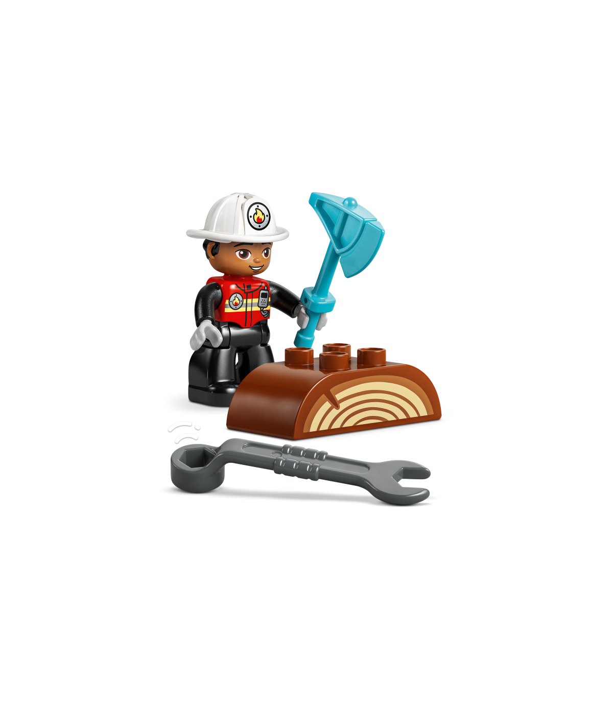 LÕBUSAID FUNKTSIOONE TÄIS – Komplektis on eemaldatava haagisega tuletõrjeautomudel, tuletõrjuja figuur, LEGO® DUPLO® orav, kirves ja mutrivõti, mis ergutavad kujutlusvõimelist päeva päästmise mängu