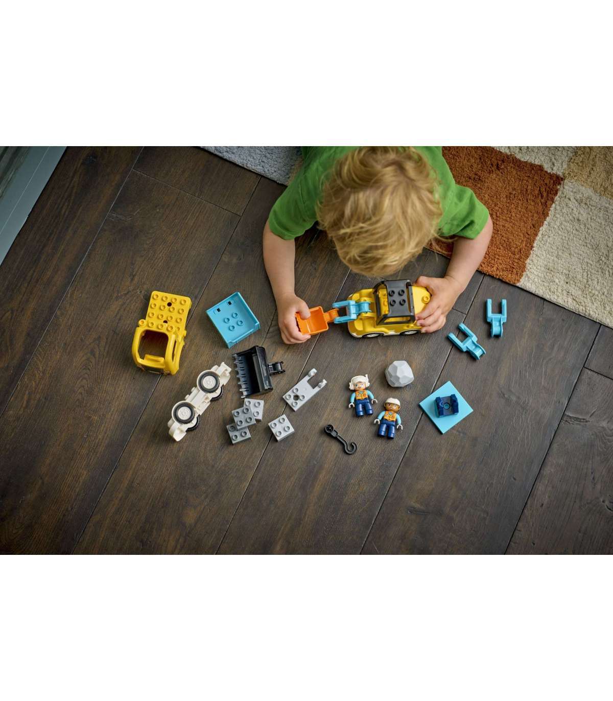 1 KOMPLEKT, 6 SÕIDUKIMÄNGUASJA – Selle väikelapse LEGO® DUPLO® komplekti klotsid saab kokku panna kaheks konksudega puksiirautoks, laaduriks, käärtõstukiks, kallurveokiks ja poomiga ekskavaatoriks
