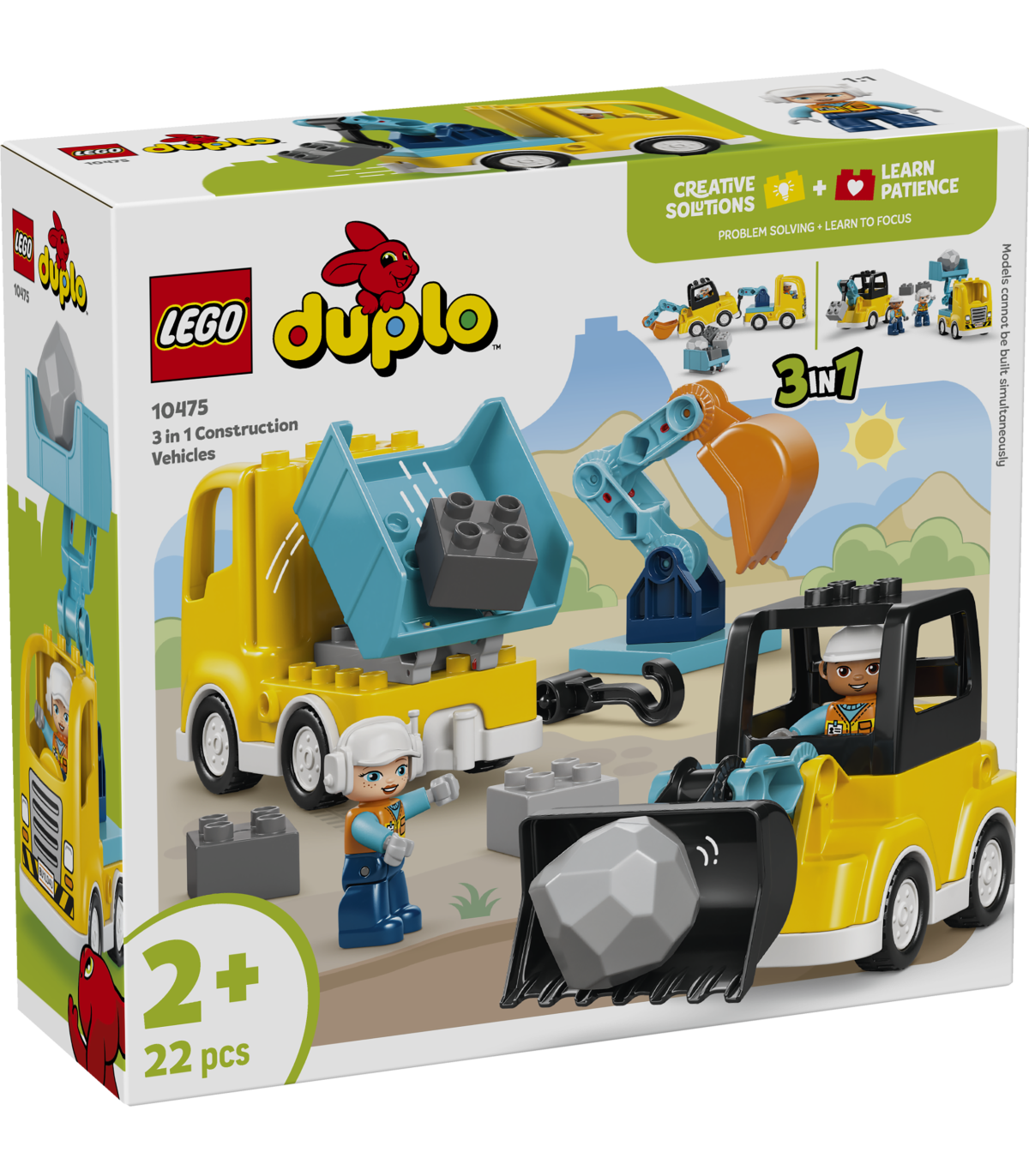 MÄNGUASJAD VÄIKELASTELE – Erguta väikelaste loovust LEGO® DUPLO® linna Kolm ühes ehitusmasinate (10475) komplektiga, mille 22 klotsi abil saab kokku panna 6 veoautomänguasja