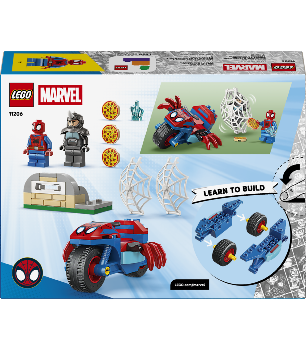 Spidey mootorratta ehitusmänguasi – Naudi superkangelaste seiklusi komplektiga LEGO® ǀ Marvel Spidey ja tema hämmastavad sõbrad Spidey oma mootorrattal vs. Rhino (11206), mis on mõeldud alates 4-aastastele poistele, tüdrukutele ja lastele