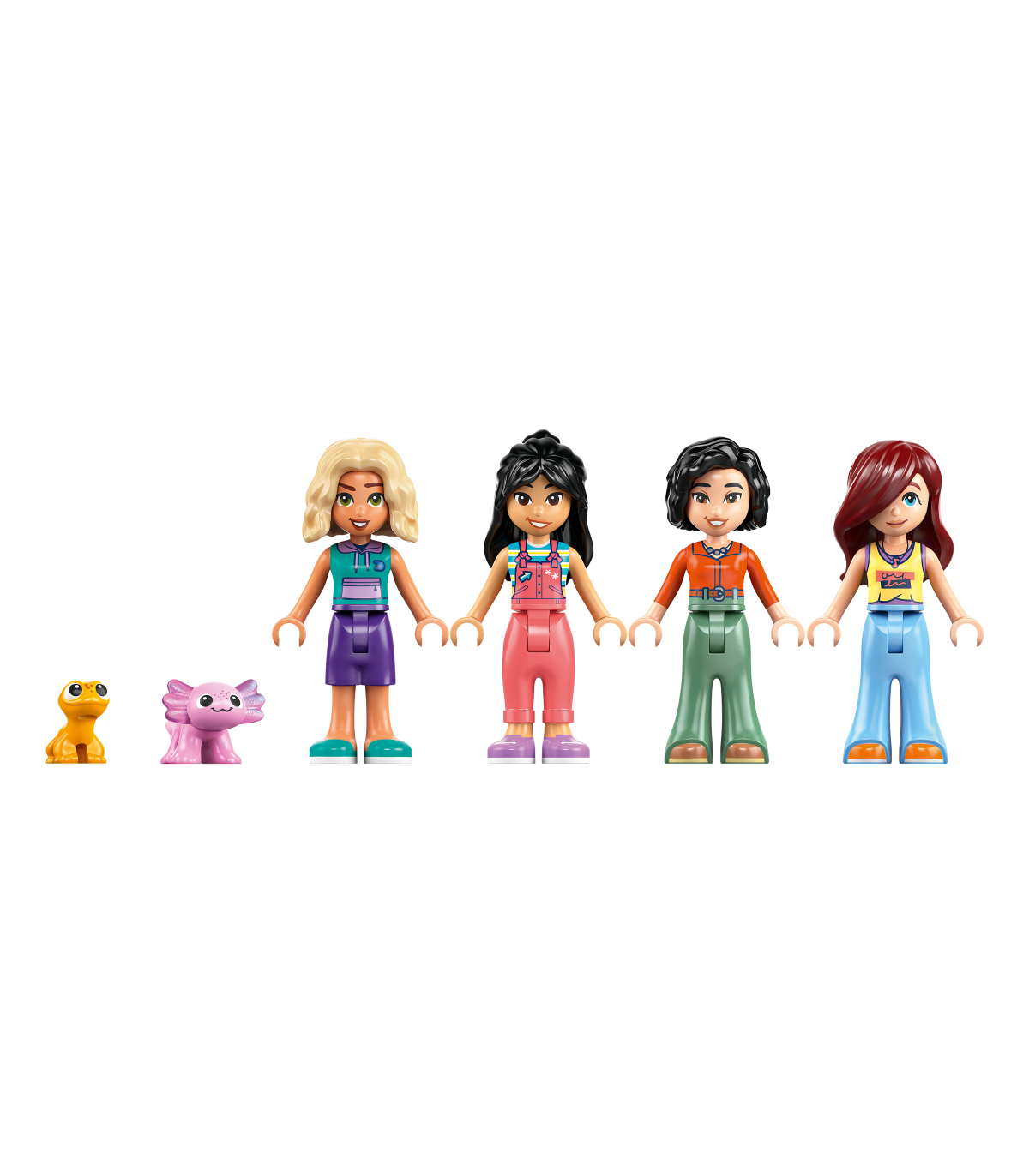4 LEGO® FRIENDS TEGELAST – Selles rollimängukomplektis on mininukud Liann, Michelle, Paisley ja Nova ning lemmikloomad geko ja aksolotl koos oma terraariumite ja toiduga
