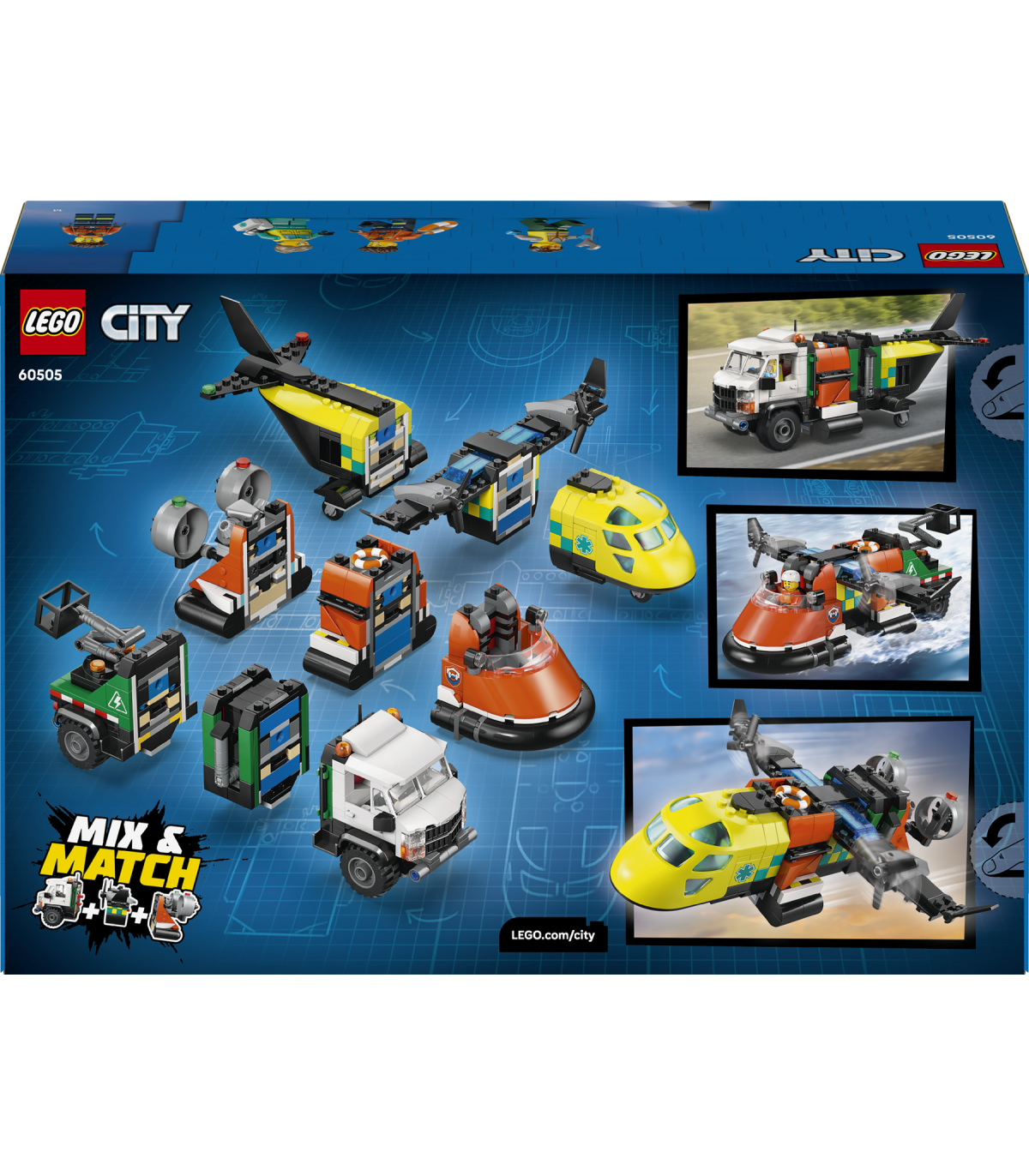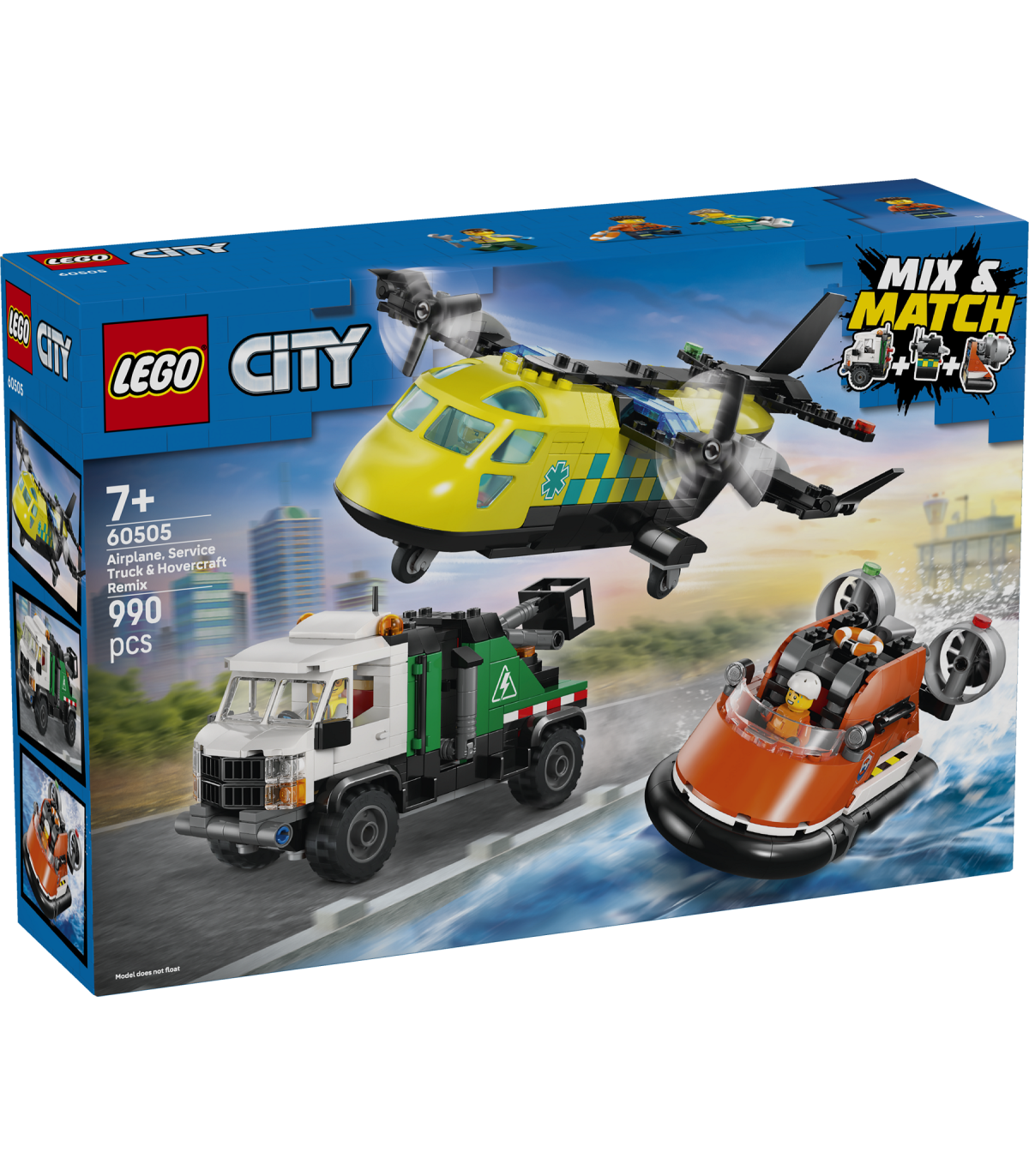 3 HÄDAABISÕIDUKI MÄNGUASJA 1 KOMPLEKTIS – LEGO® City lennuki, hooldusauto ja hõljuki remiks (60505) on rollimängukomplekt, mis sisaldab 3 kombineeritavat päästesõidukit ja on mõeldud lastele alates 7. eluaastast