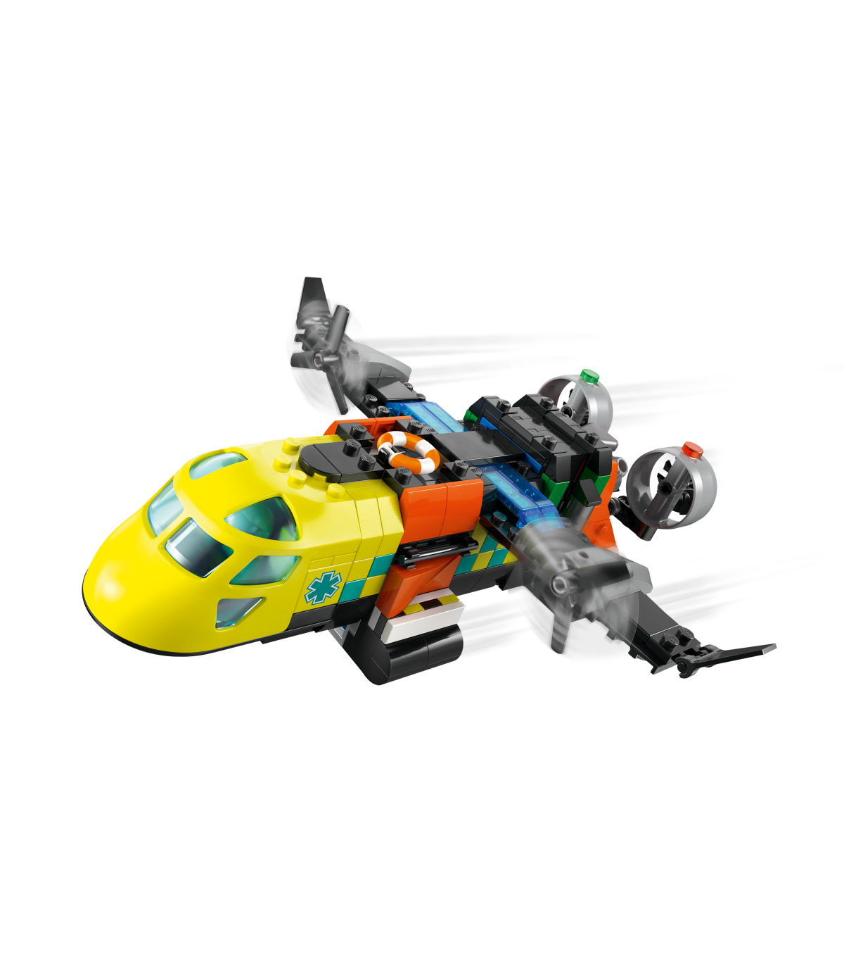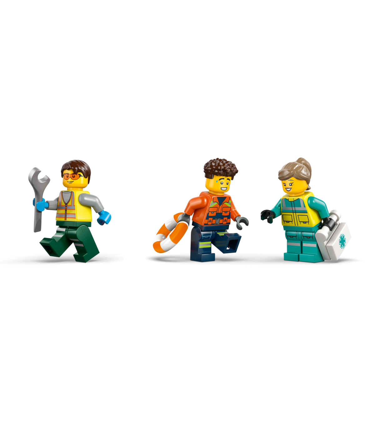 SISALDAB 3 IKOONILIST SÕIDUKIT – See mudelite komplekt sisaldab LEGO® City meditsiinilennukit, rannavalvehõljukit ja teenindusautot, lisaks meediku, rannavaluri ja mäepäästja minifiguure