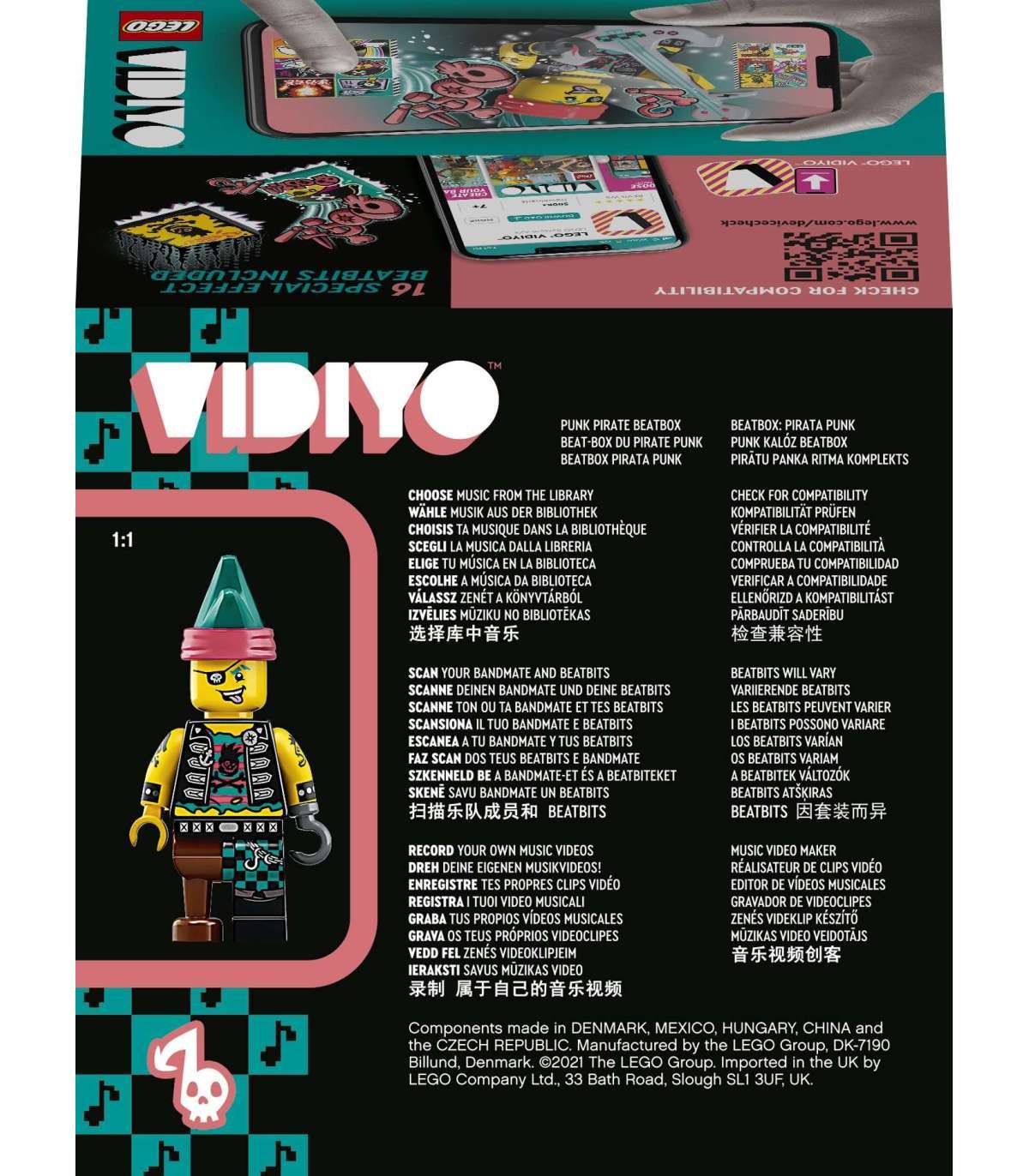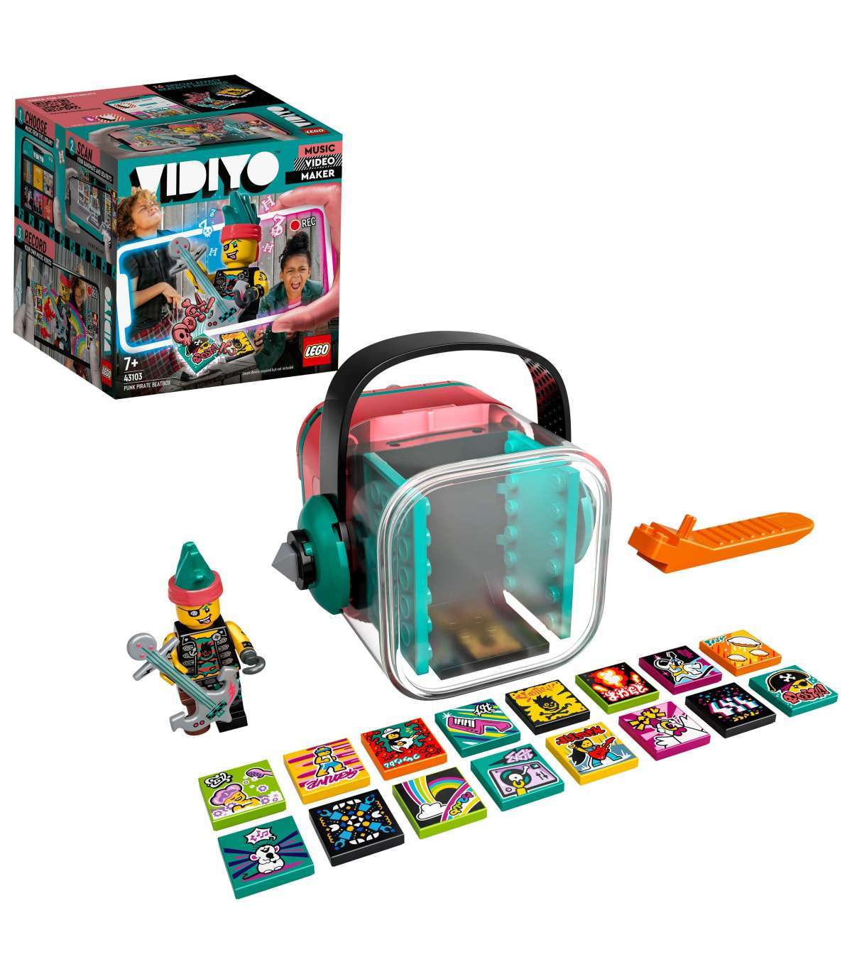 • Innusta lapsi lavastama oma muusikavideoid ja nendes peaosa mängima LEGO® VIDIYO™ Punk Pirate BeatBoxi (43103) abil. Komplektis on punkpiraadi minifiguur kitarriga, 14 juhuslikku BeatBiti ja kaks erilist BeatBiti. • Laadi alla tasuta rakendus LEGO® VIDIYO™, et skannida minifiguuri ja eriefektidega BeatBite. Lastel on põnev vaadata, kuidas nende tegelane ärkab punkstiilist inspireeritud muusikavideos ellu. • Skanni rakenduses BeatBite, et avada eriefekte, nt lahe efekt, mis asendab sõnad punkpiraadist inspireeritud fraasiga „arrr“. • Vahva muusikalahendus vähemalt 7-aastasele poisile või tüdrukule, kes väärib preemiat. See mängukomplekt on ka suurepärane pühadekingitus lapsele, kes armastab muusikamänguasju, tantsimist ja esinemist. • BeatBox on 8 cm kõrgune, 7 cm pikkune ja 10 cm laiune. • BeatBox käib kokku, et lapsed saaksid oma muusikalise maailma endaga igale poole kaasa võtta. BeatBoxis on ruumi klotsidest ehitatud lava, 16 BeatBiti ja punkpiraadi kitarri jaoks. • LEGO® VIDIYO™ rakendus ühildub valitud iOS-i ja Androidi seadmetega. Teavet ühilduvuse kohta leiad veebilehelt www.LEGO.com/devicecheck. Lapsed peaksid küsima interneti kasutamiseks oma vanematelt luba. • LEGO® VIDIYO™ komplektid pakuvad uut seltskonnamänguelamust, kus poisid ja tüdrukud saavad olla lavastajad, produtsendid ja muusikatähed, lavastades ning jagades oma muusikavideoid. • LEGO® detailid vastavad tööstusharu rangetele nõuetele, et tagada nende stabiilne kvaliteet, ühtesobivus ja kindel ühendatavus alati. Nii on see olnud aastast 1958. • LEGO® osi kukutatakse, kuumutatakse, muljutakse, väänatakse ja analüüsitakse. Nii võid kindel olla, et need vastavad rangetele üleilmsetele ohutusstandarditele.