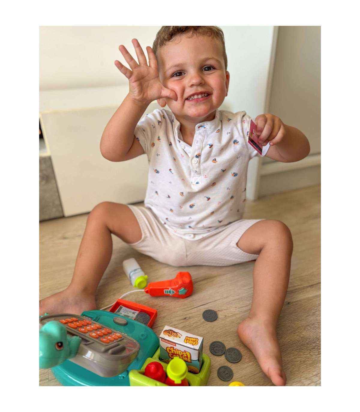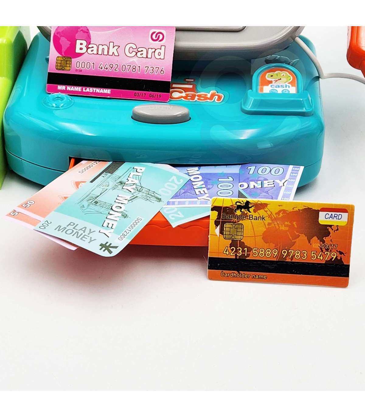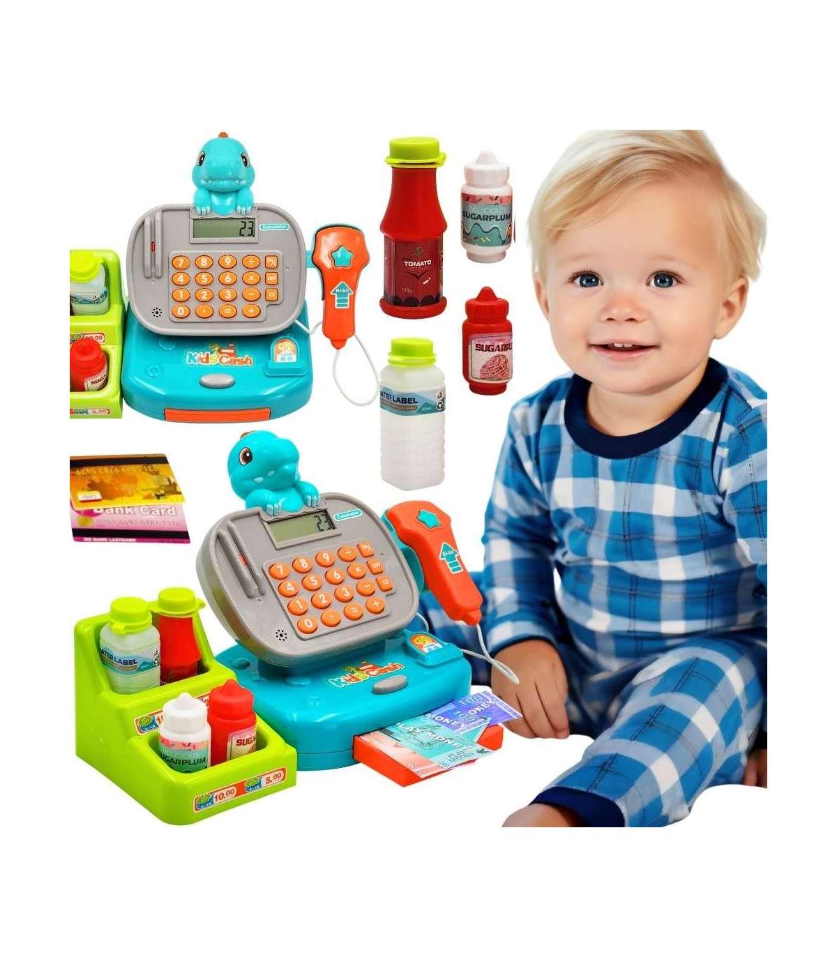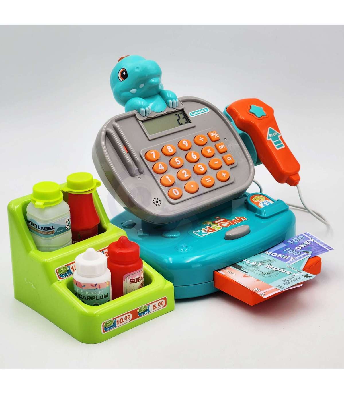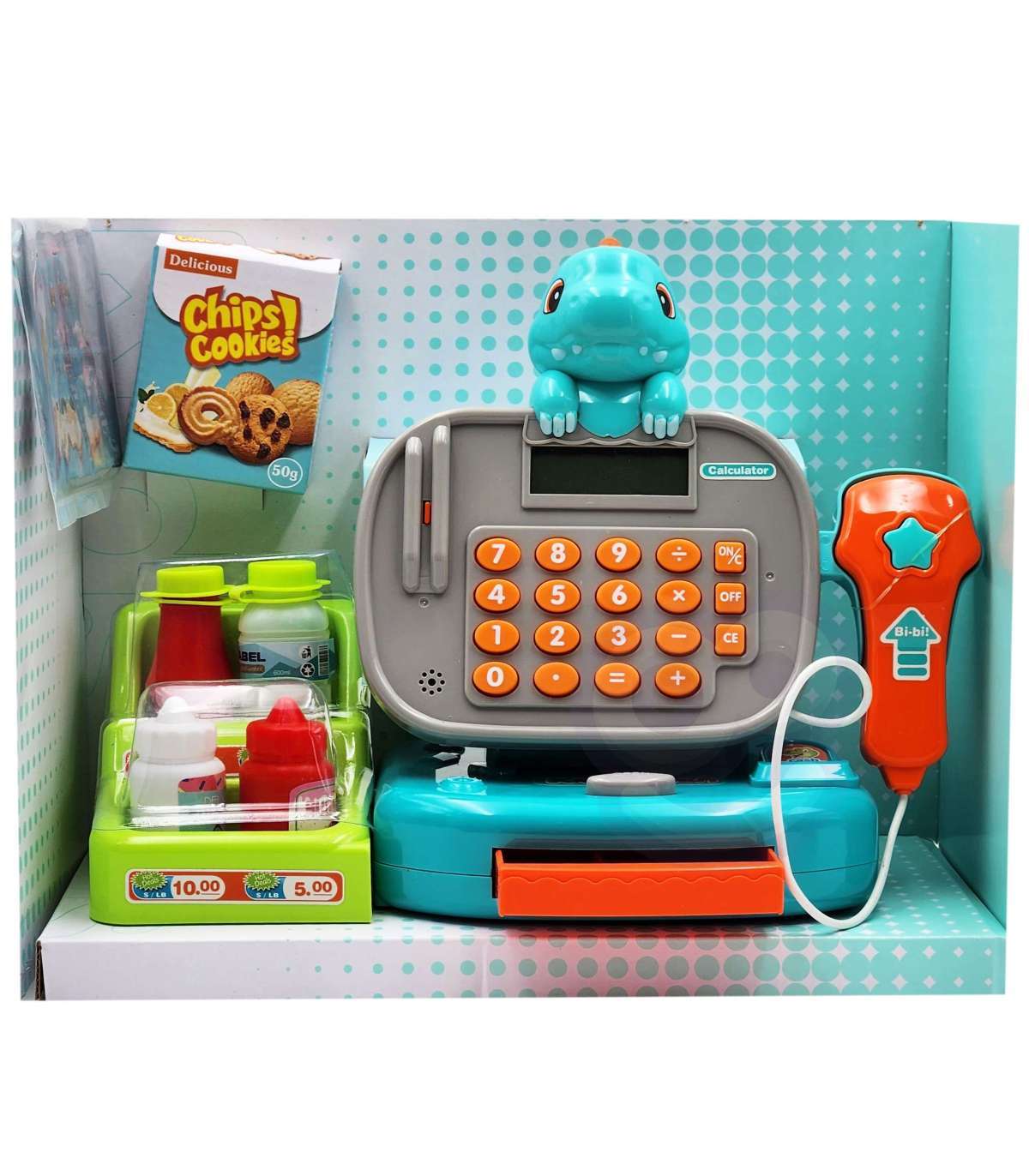 Детская касса Dino с полкой от бренда WOOPIE — идеальное предложение для игр. Дети могут выбрать товары, которые хотят купить, а затем пробить их на кассе. С помощью сканера они отсканируют печенье и другие товары. Затем покупатель может расплатиться монетами или банковской картой.
