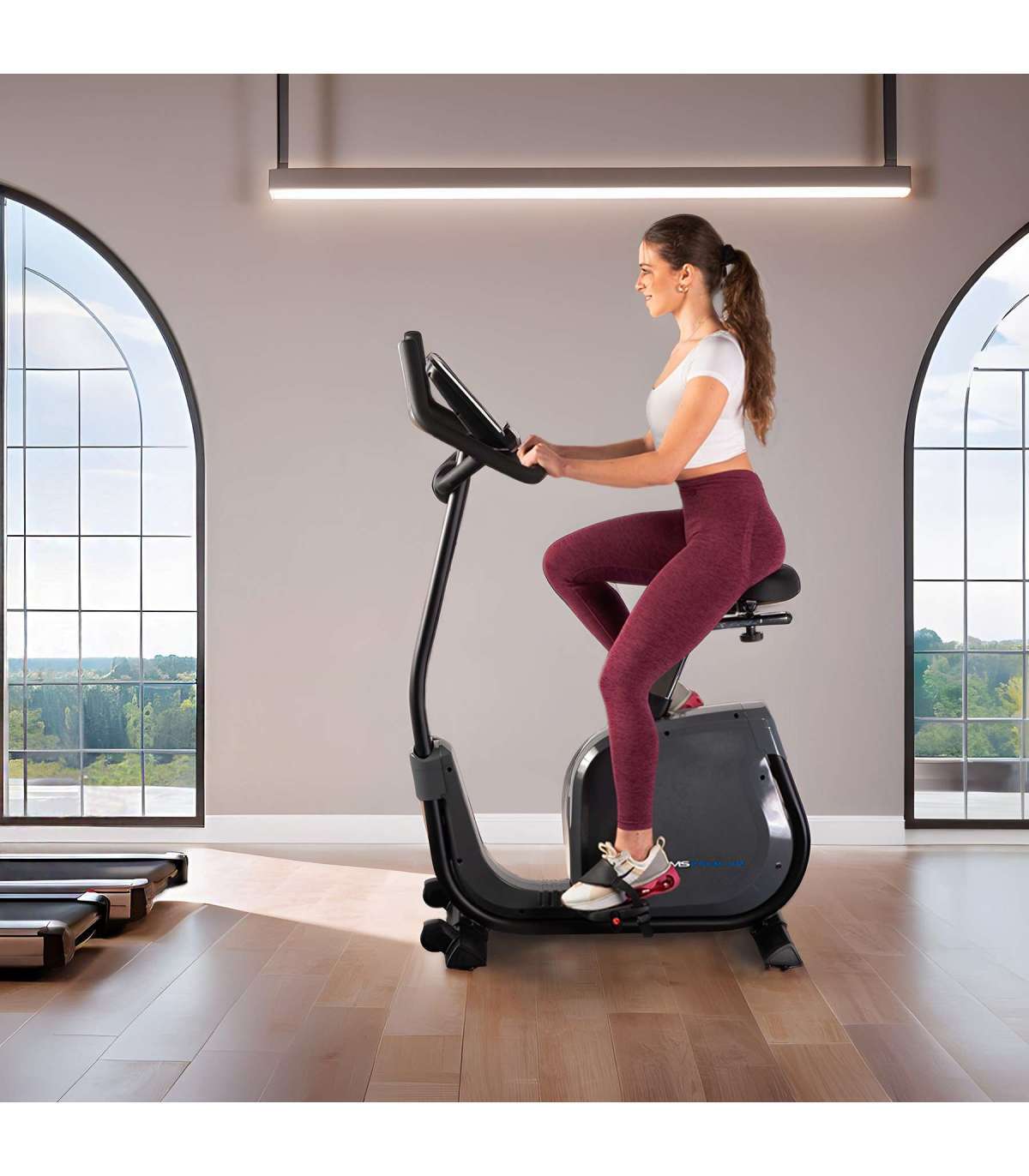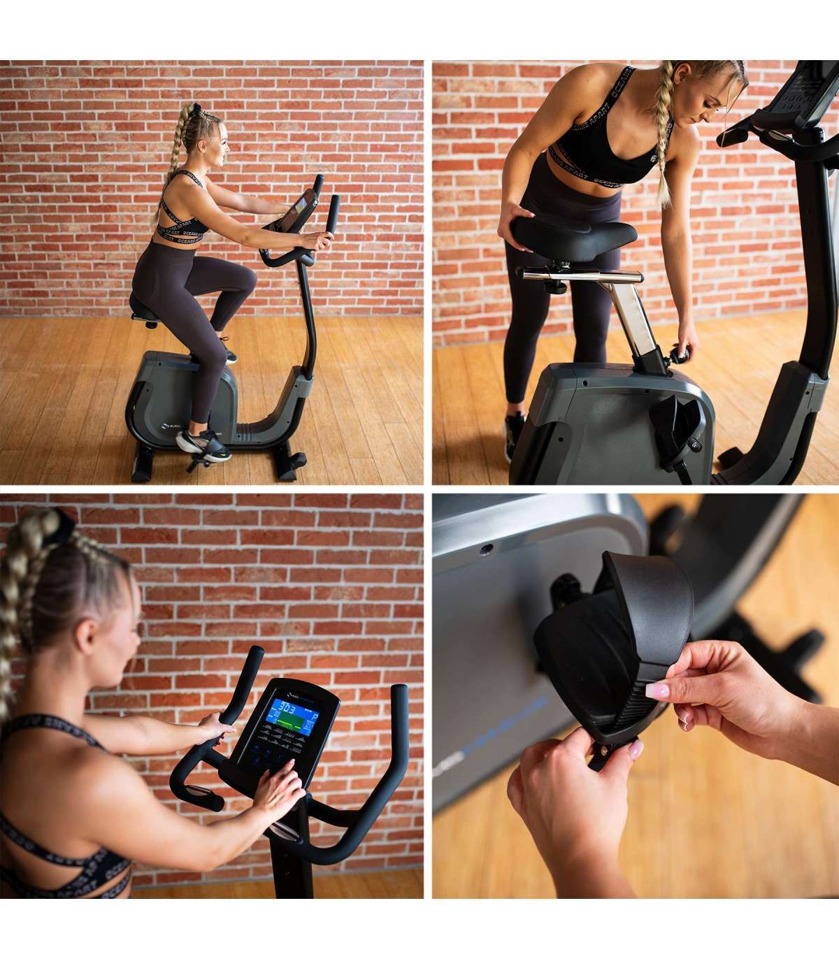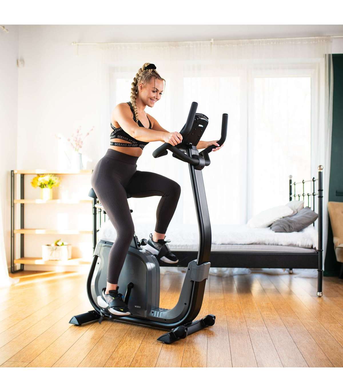 Велосипед M1815 обеспечивает исключительный комфорт благодаря вертикально и горизонтально регулируемому седлу, позволяющему идеально настроить положение. Гелевое сиденье обеспечивает максимальное удобство. Регулируемые ремни педалей гарантируют устойчивость стопы во время интенсивных тренировок, а держатель для планшета позволяет использовать мобильные устройства во время езды.