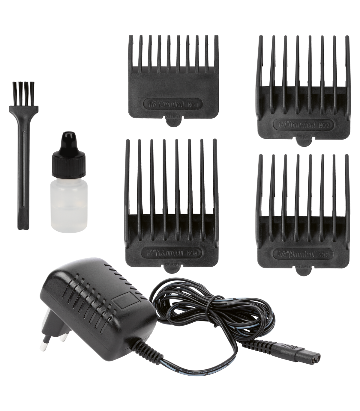Incl. 8 accessories: travel charging adapter, cleaning brush, 4 comb attachments (3, 6, 9, 13 mm), oil, covering cap.
