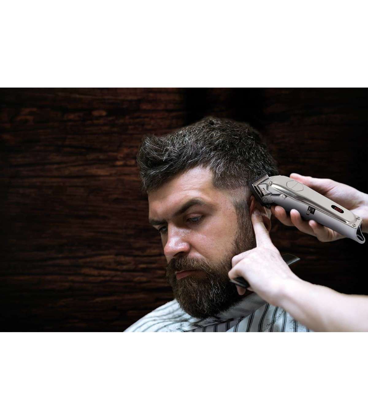 Incl. 8 accessories: travel charging adapter, cleaning brush, 4 comb attachments (3, 6, 9, 13 mm), oil, covering cap.