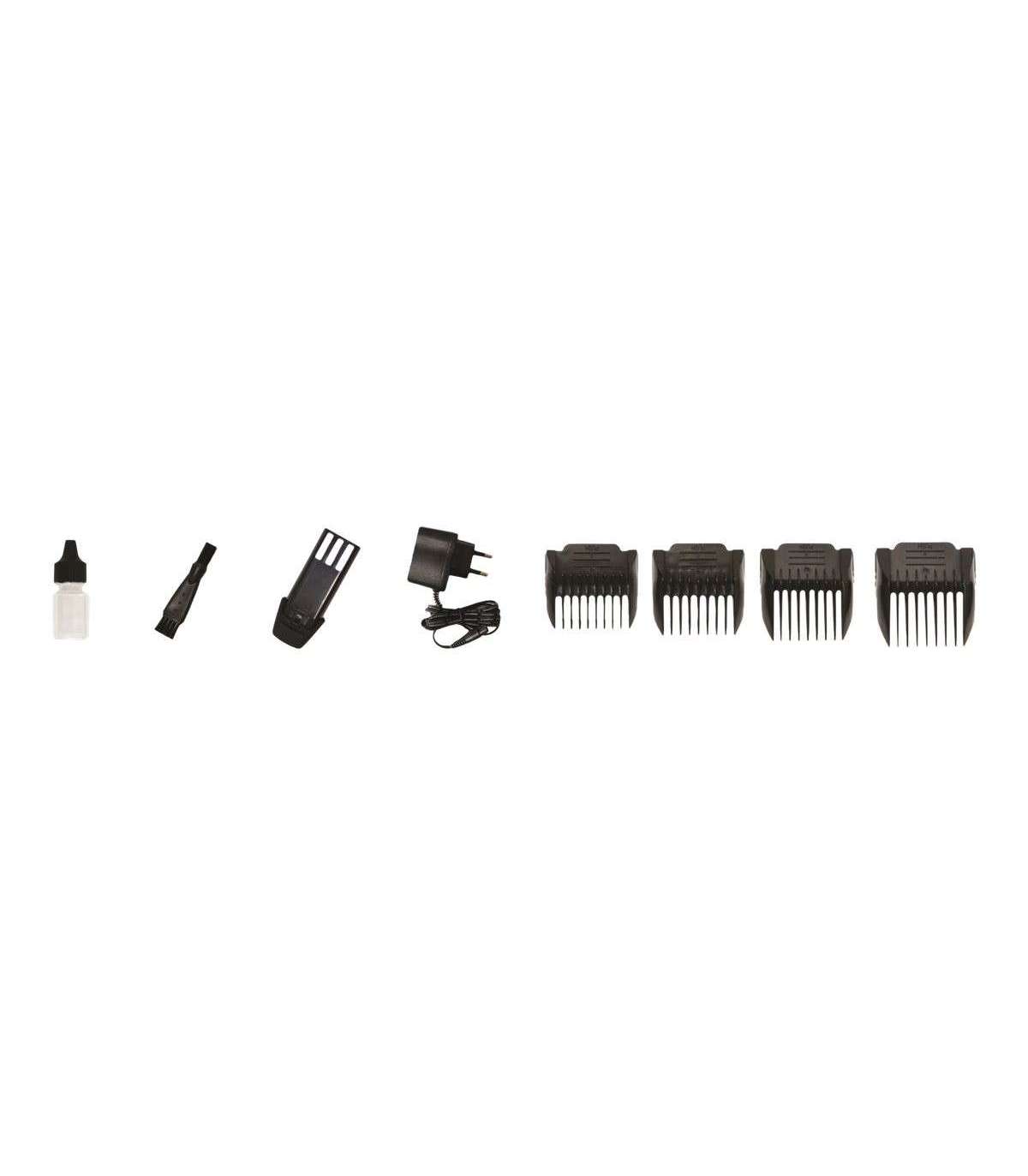 Titanium head with ceramic blade; Precise hair cut adjastment in the ring; 4 comb attachments: 3, 6, 9, 12 mm;Cord or cordless operation;Set includes oil, brush and charger.