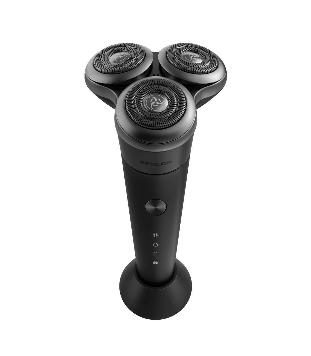 Package includes: shaver, blade guard, travel bag, cleaning brush, storage stand.