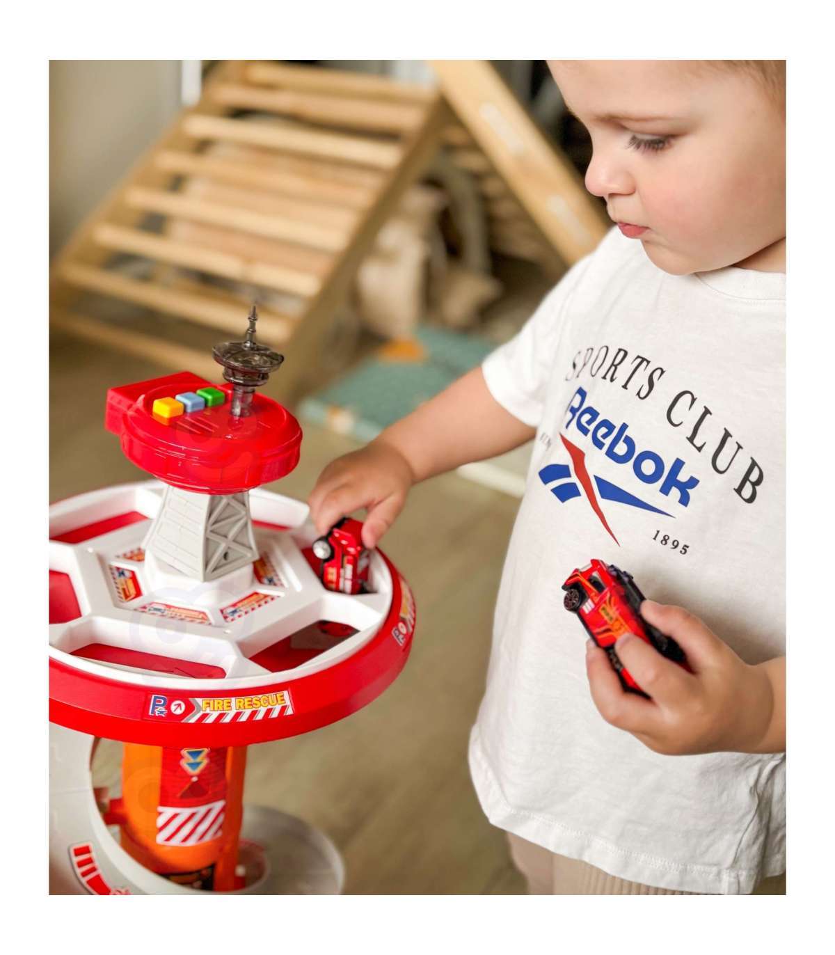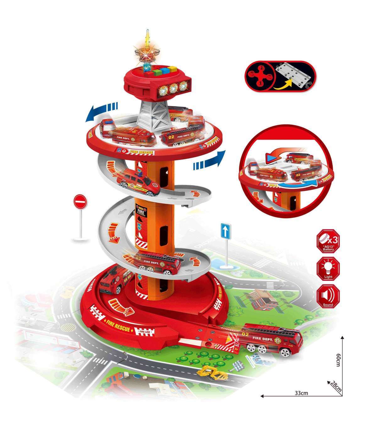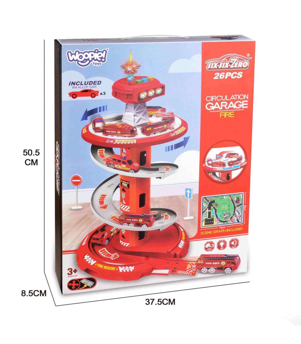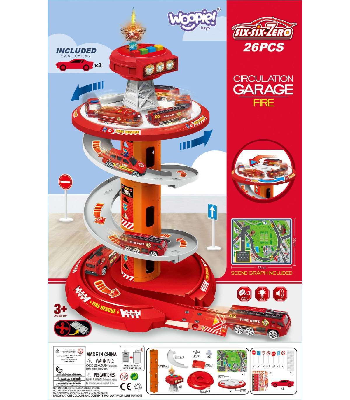 Потрясающая многоуровневая вращающаяся парковка-гараж для пожарной службы от компании Woopie обязательно понравится ребёнку. Эта игрушка разбудит воображение каждого фаната форменных служб, которая после выезда с парковки выходит на включённую в набор дорогу. Быстрое спускание автомобилей с отдельных уровней возможно благодаря специальному извилистому съезду. Кроме того, в комплекте находятся 3 разных автомобиля пожарной службы.