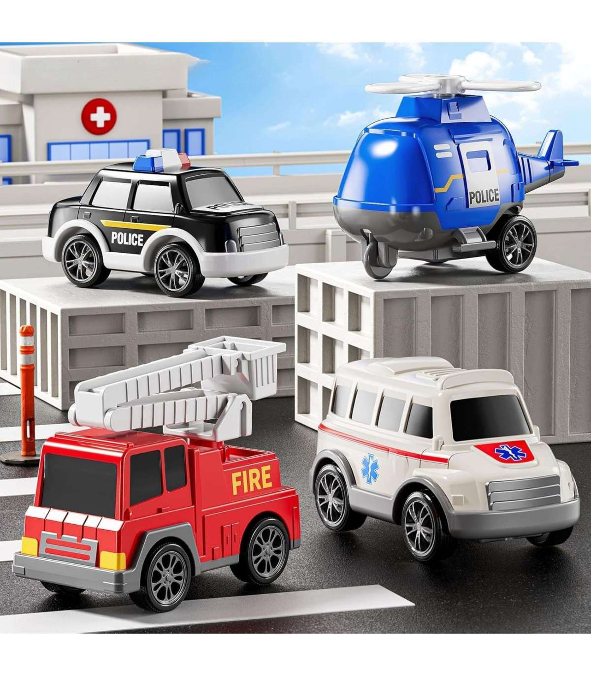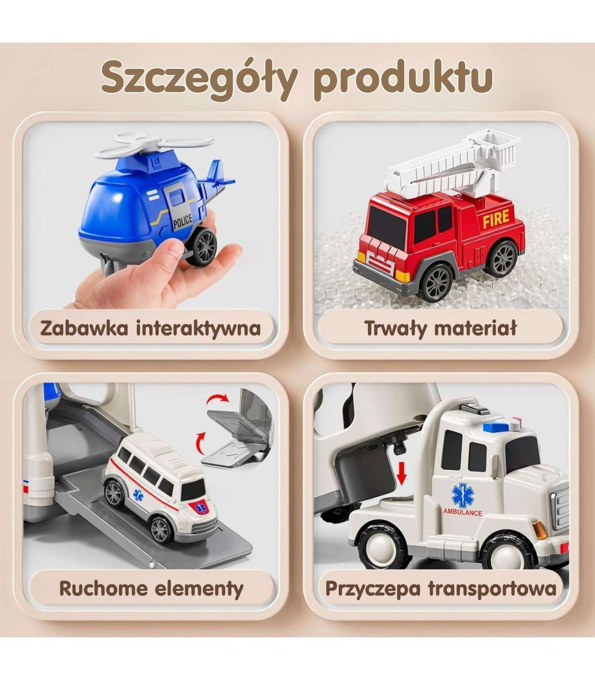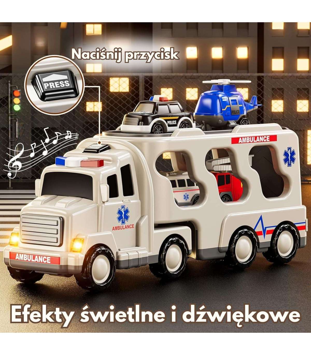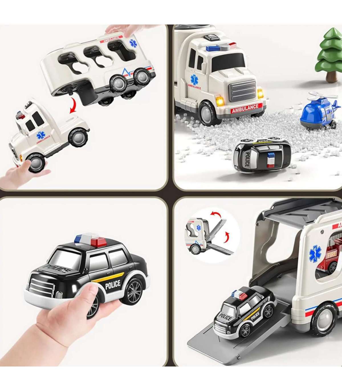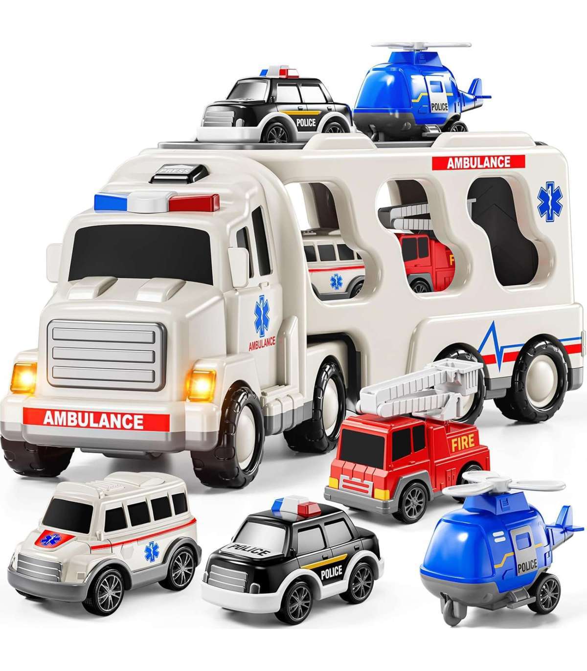Большой спасательный набор: грузовик + 4 машинки от бренда Woopie Создан для маленьких поклонников пожарной службы, полиции, скорой помощи — эта игрушка 5 в 1 является идеальным набором для каждого маленького спасателя! Нажмите кнопку на верхней части кабины грузовика, чтобы увидеть яркие мигающие огни и услышать реалистичные сирены, что очень привлекательно для детей. Набор включает большой транспортный грузовик и четыре спасательных машины: пожарную машину, патрульный автомобиль, полицейский вертолет, скорую помощь. Каждое транспортное средство имеет подвижные детали, которые позволят вашему ребенку почувствовать себя настоящим героем во время спасательных операций! Набор — отличная идея для подарка на день рождения, Рождество или другой повод.