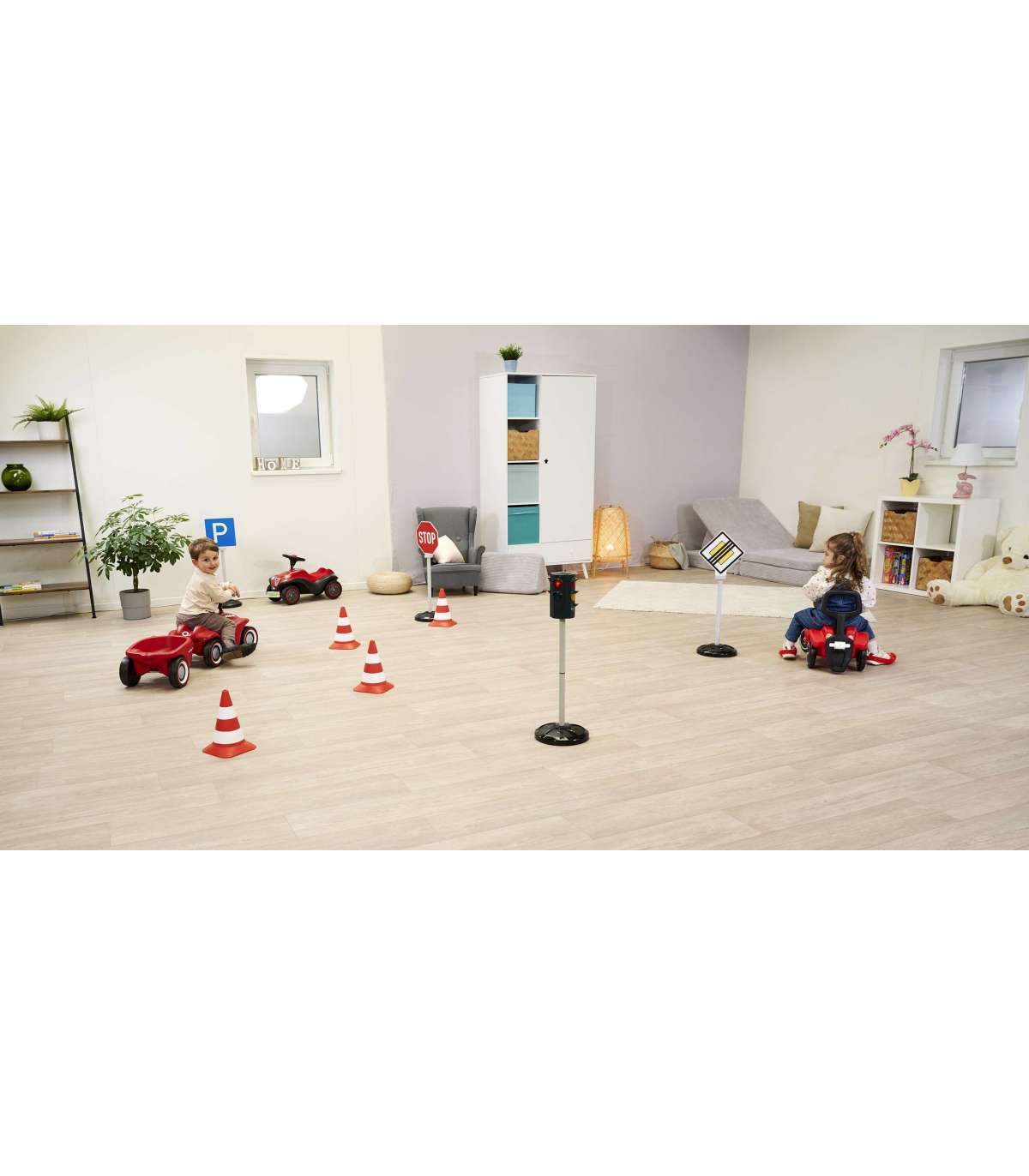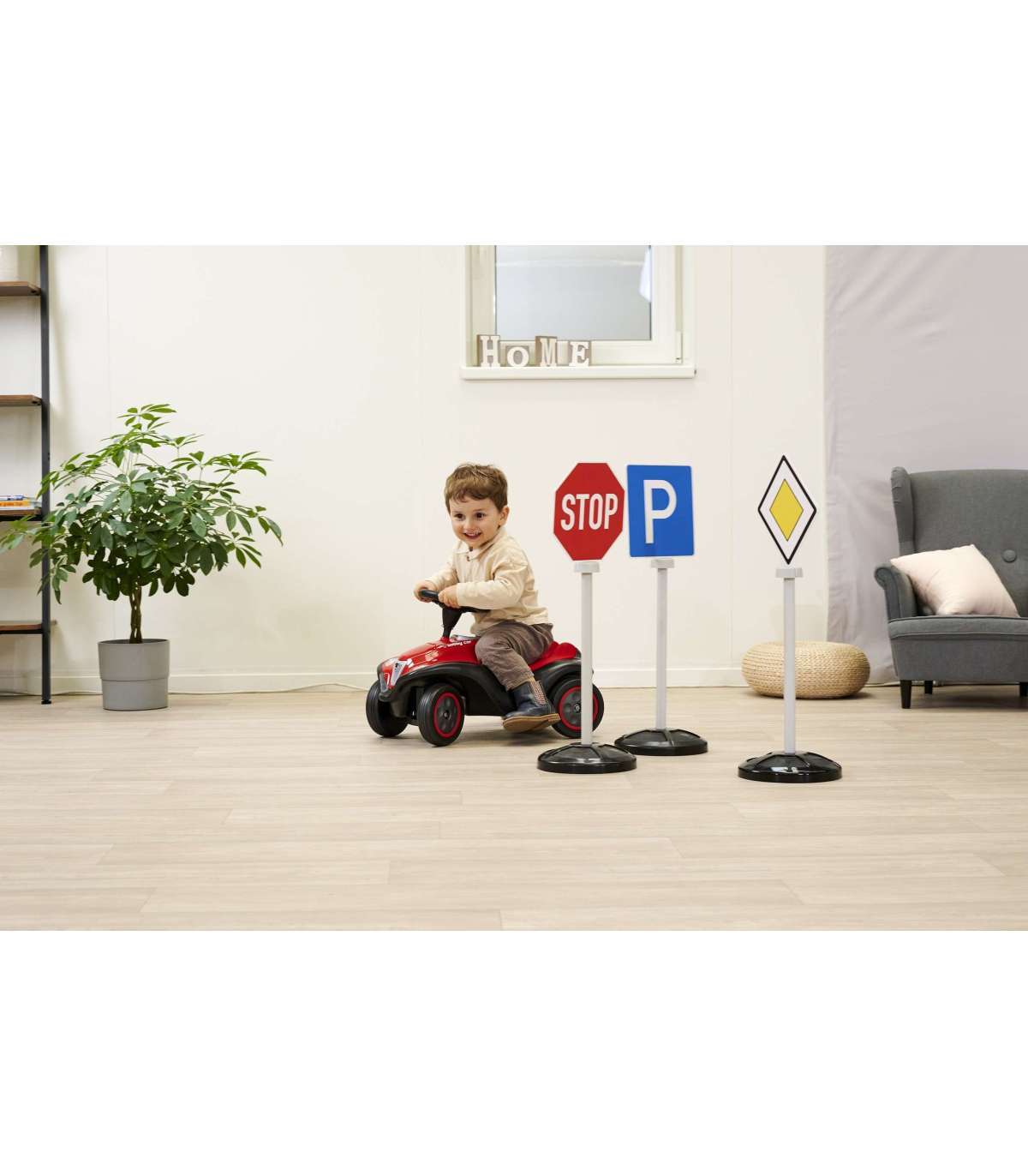 - Обучающий набор — 3 дорожных знака с 5 различными обозначениями, помогающими детям понять основы правил дорожного движения.