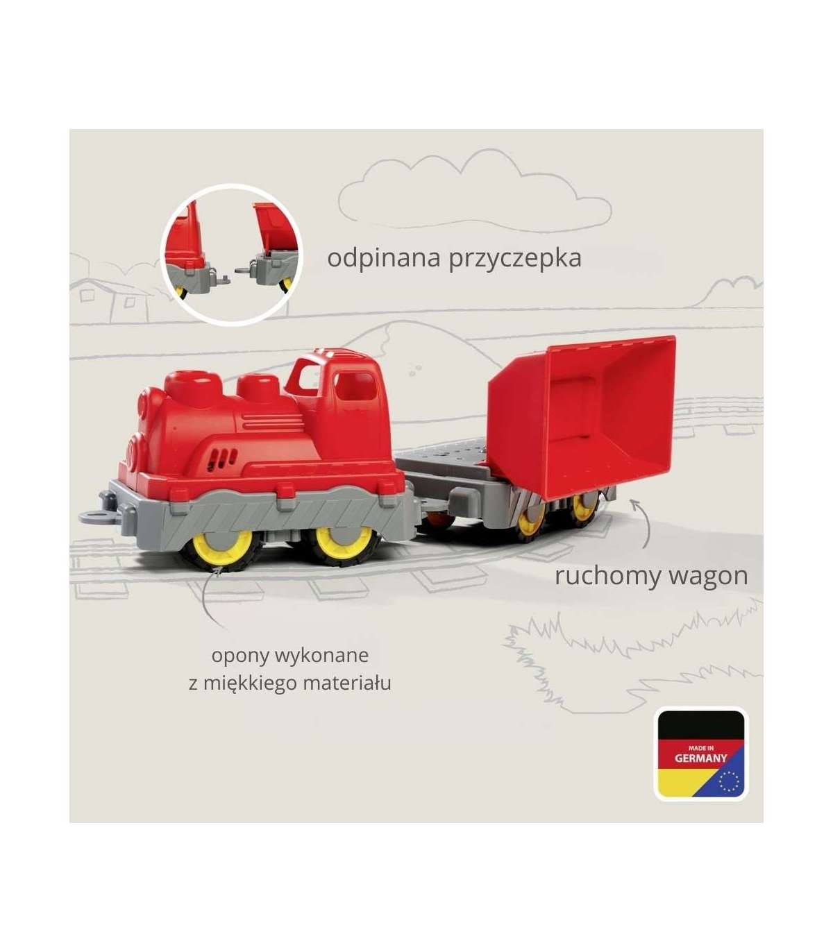 - 2-частный набор — Локомотив с отсоединяемым вагончиком-самосвалом позволяет реализовать разнообразные сценарии игры. Транспортируйте, соединяйте и разъединяйте — как на настоящей стройке!