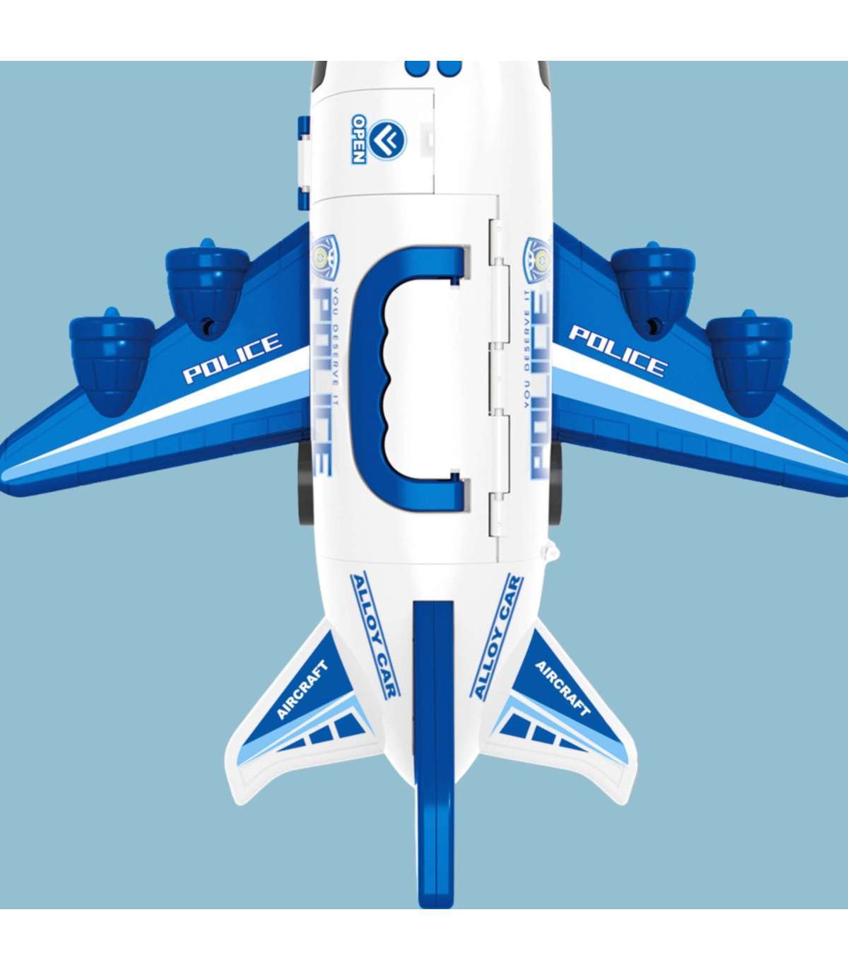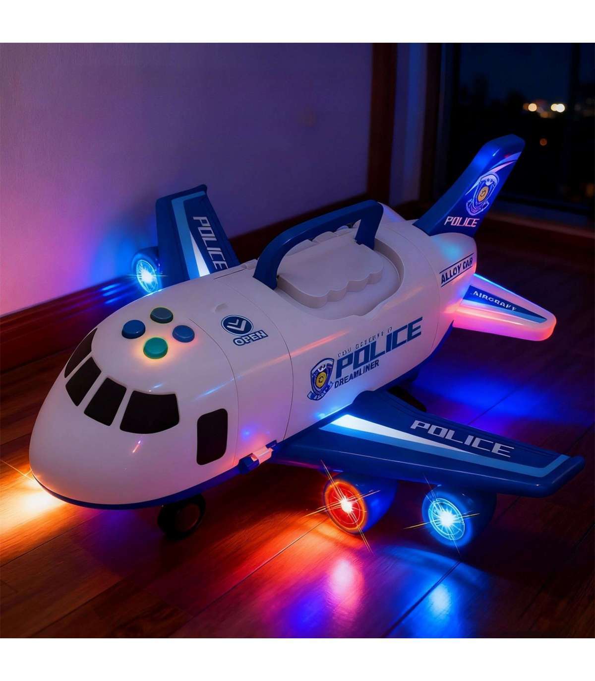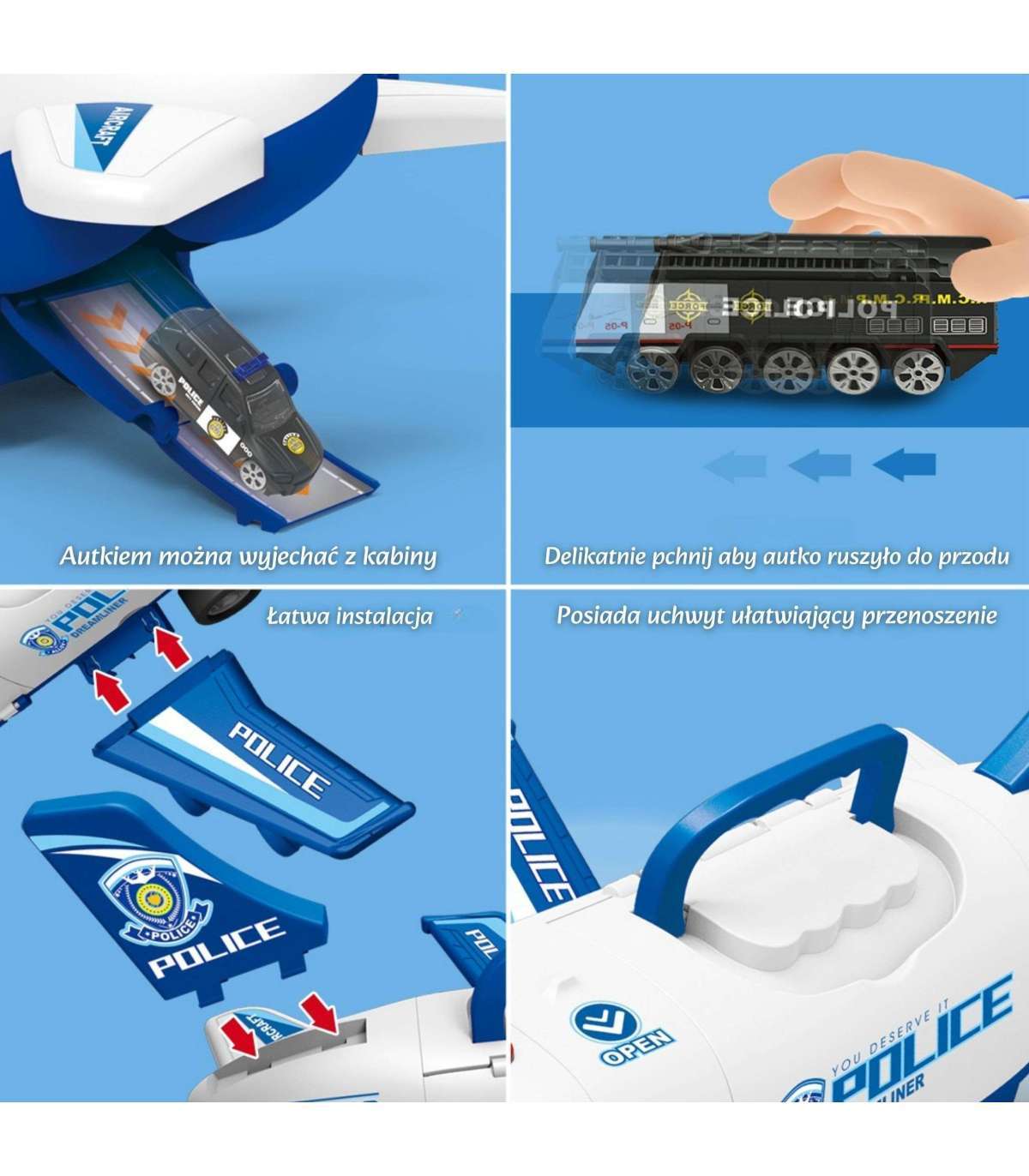 Poznaj DUŻY otwierany samolot-transporter policyjny od marki WOOPIE! który zabierze dziecko w ekscytującą misję stróżów prawa! W przestronnym kadłubie samolotu zmieszczą się trzy policyjne auta oraz komplet znaków drogowych, co zapewnia dynamiczną zabawę. Dzięki czterem przyciskom zabawka wydaje realistyczne syreny policyjne, a migające diody LED dodają akcji dynamiki. Rampa samolotu opada, a uchwyt ułatwia przenoszenie, co sprawia, że to zabawka mobilna i praktyczna. To wymarzony prezent dla małego policjanta od 3. roku życia, który rozwija wyobraźnię i uczy pracy zespołowej.