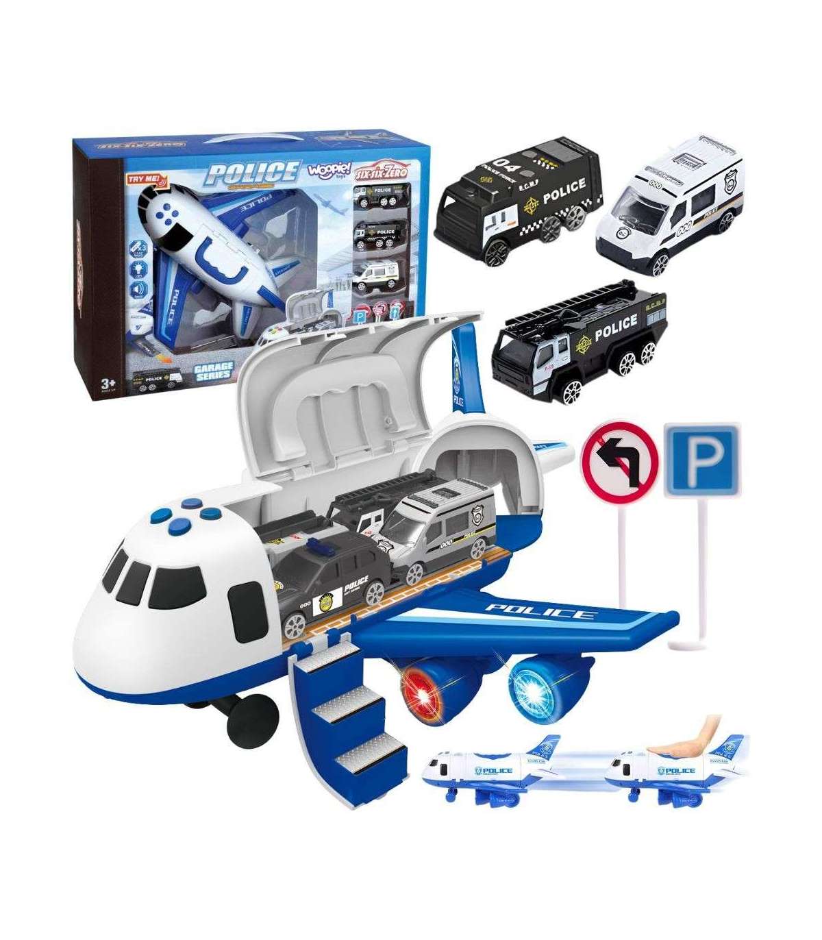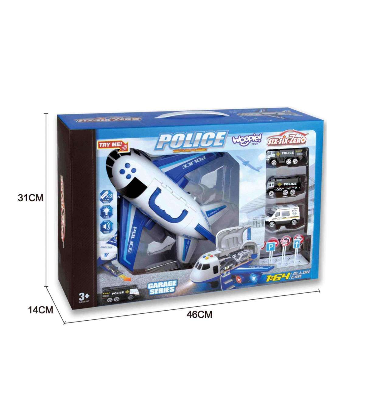 WOOPIE Samolot Rozkładany Transporter Policja z 3 Autami Policyjnymi Zestaw XL Znaki Drogowe