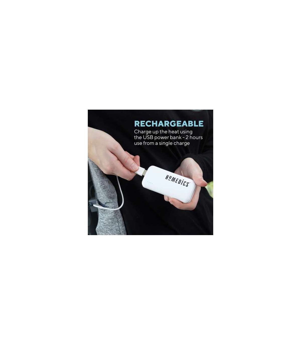 HoMedicsi seljatoepadjal on turvaline ja lihtne toolile kinnitada. See on varustatud elastsete rihmadega. See on laetav kaasasoleva USB-toitepanga abil, nii et saate oma padja endaga kaasa võtta.