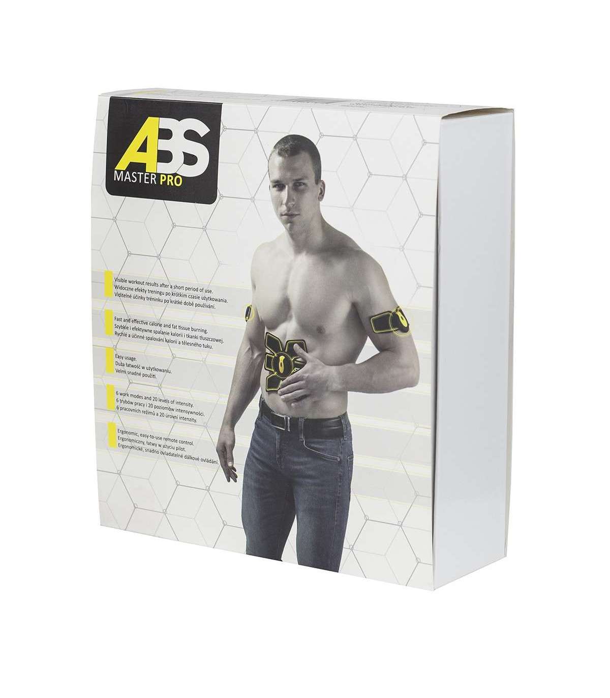 ABS Master Pro is your personal way to build a perfect silhouette. It's a muscle shaping revolution. Its main goal is to build and to strengthen abdominal muscles, but due to additional panels it will work for the whole body. It is a perfect complement to the classic training. It facilitates increase of strength and endurance of muscles.EMS electric waves, which ABS Master Pro lets through a body, force muscle contraction and relaxation. This pulse comes from an electrode placed in the cap, which is put on during a workout. The impulses reach the deepest muscle fibers, which improves their form and warrants results much faster compared to a classic workout.The device has 6 operation modes and 20 levels of intensity. Consequently, one can perfectly match the workout to his/her needs and the proficiency level. ABS Master Pro can be used during a classic workout as well as at the time of daily activities. The main difference between a standard training and ABS Master Pro is that joints are not strained. EMS waves shape and strengthen the body without a risk of injury.To achieve effects with ABS Master Pro you need 20 minutes a day only, without extensive effort and murderous exercises. Thanks to this revolutionary small device you will significantly improve the efficiency of your workouts, save time and money and moreover, you avoid a situation when an injury is even possible. Additionally, you will strengthen your muscles, improve your fitness, burn unnecessary fat tissue and make they your metabolism jumps into a higher level. ABS Master Pro is great irrespective of your age and proficiency level.Specification:Color: black-yellowMassage device type: electrostimulatorMuscle stimulator:belly: yesarms: yesNumber of intensity levels: 20Number of operating modes: 6Set contains:large main panel: yessmall panel: yestransmitters: yesremote: yesMain panel dimensions (lgth/wdth) (mm): 180 x 168Small panel dimensions (lgth/wdth) (mm): 180 x 93Main panel power supply: built-in batterySmall panel power supply: built-in batteryButtock panel power supply: built-in batterySafe ambient temperature: 15 ÷ 35 deg. CProduct weight (g): 200Remarks: Not for commercial use24 months warrantyImporter: Abisal Ltd. | Poland | 41-807 Zabrze | Pyskowicka Street 17 | e-mail: abisal@abisal.plAbisal Ltd.. declares that the products sold by the company are safe and meet the requirements contained in the Act on General Product Safety of December 12, 2003. (Journal of Laws of December 31, 2003)