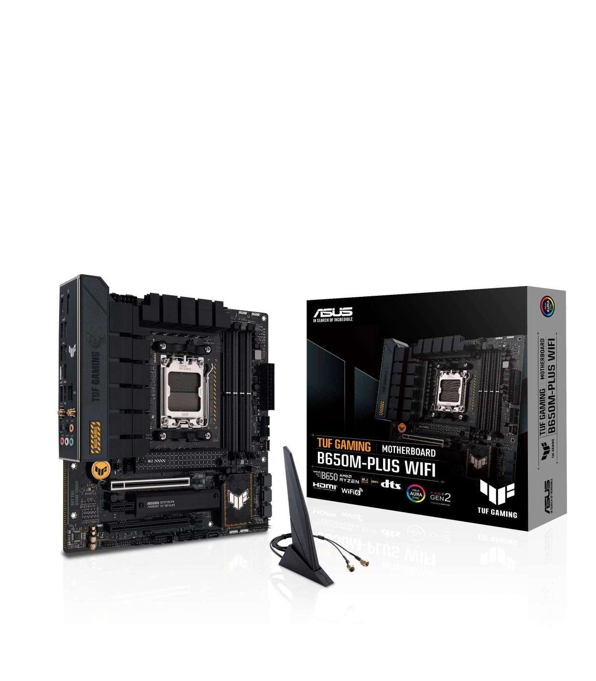 Asus | TUF GAMING B650M-PLUS WIFI | Processor family AMD | Processor socket AM5 | DDR5 DIMM | Memory slots 4 | Supported hard disk drive interfaces SATA, M.2 | Number of SATA connectors 4 | Chipset AMD B650 | micro-ATX