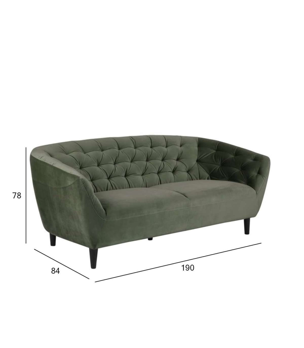 Diivani muudavad stiilseks sametine polster ja detailid. Metsaroheline sametkangas on iseloomuliku pehme tunnetusega ja lisab diivanile sügavust. Diivanil on pocket-vedrud, mis tagavad suurepärase istumismugavuse. Jalad on kummipuidust, musta värvi. Toote mõõdud on 84x191xH78cm.