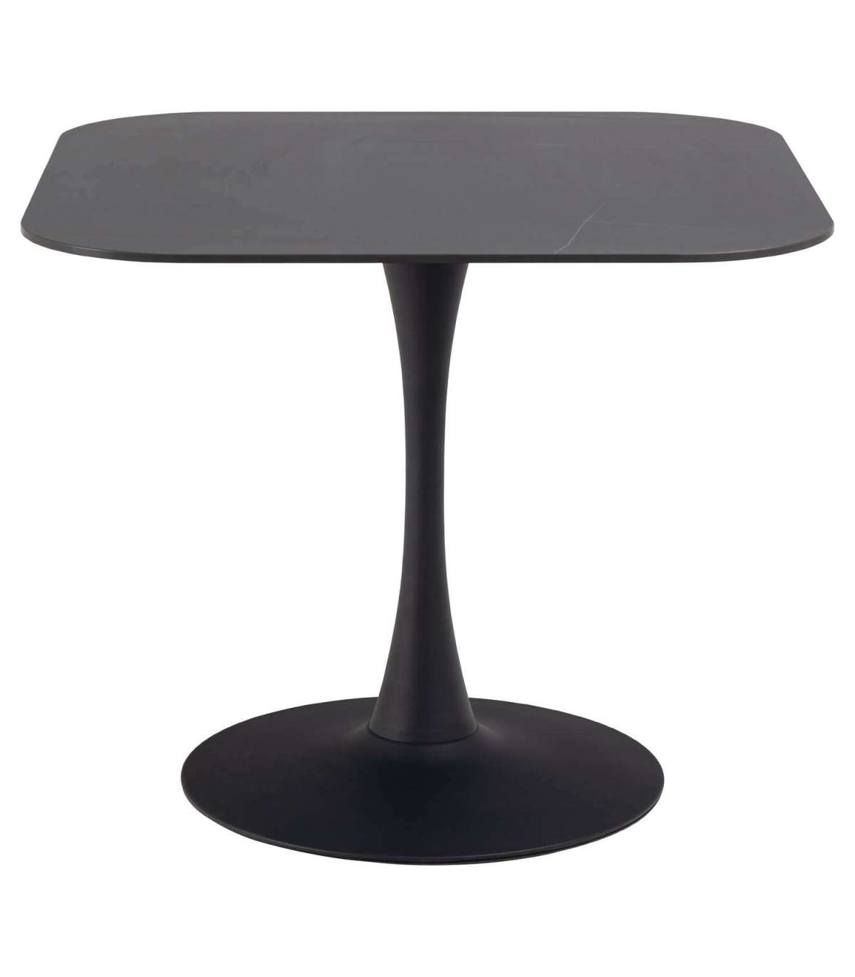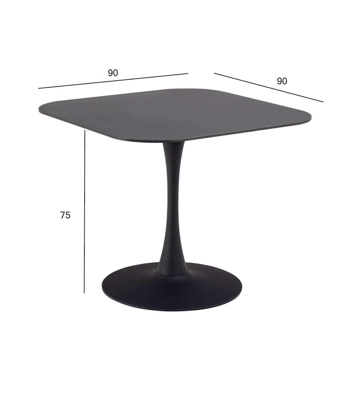Vastupidav ja stiilne kandiline söögilaud. Kuumus- ja kriimustuskindel keraamiline lauaplaat. Must pulbervärvitud metallist alus. Mahutab mugavalt 4 inimest. Toote mõõdud on 90x90xH75cm.
