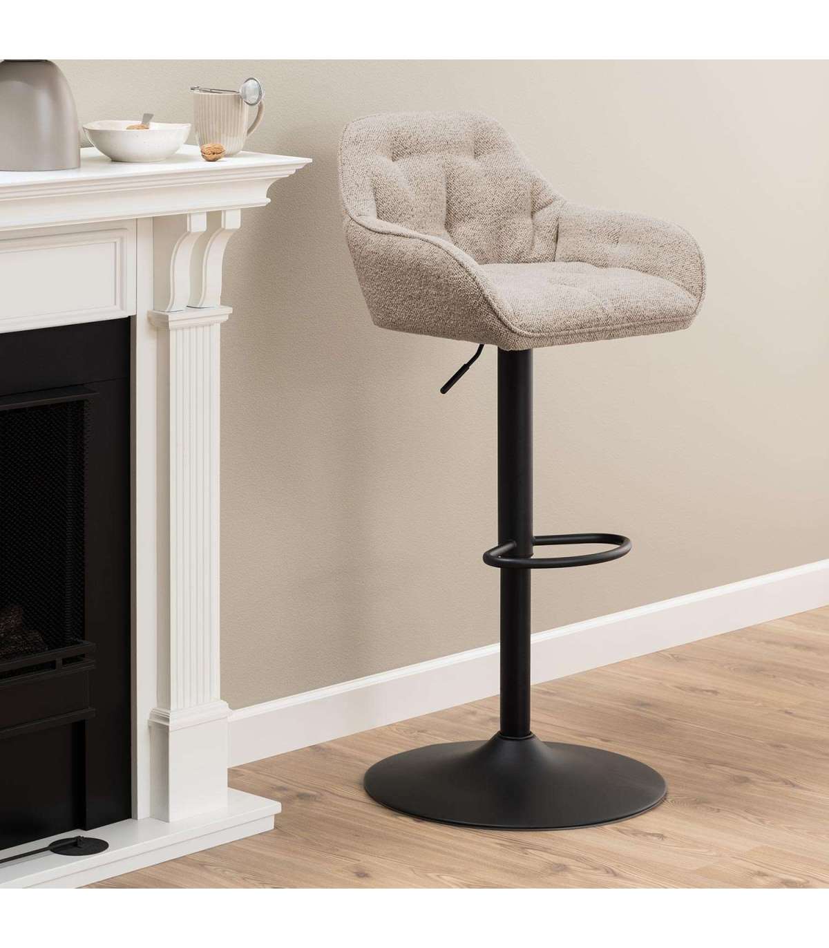 Baaritool on ideaalne lisandus igasse kööki, kas hommikuse kohvi või pärastlõunaste jookide nautimiseks. Baaritool on polsterdatud pehme beeži bukleekangaga, millel on luksuslik tekstuur. Baaritoolil on must terasest jalg. Sellel on jalatugi, pöörlev funktsioon ja gaasitõstuk. Istme kõrgust saab reguleerida 63-84cm. Mõõdud on 52x52xH109cm.