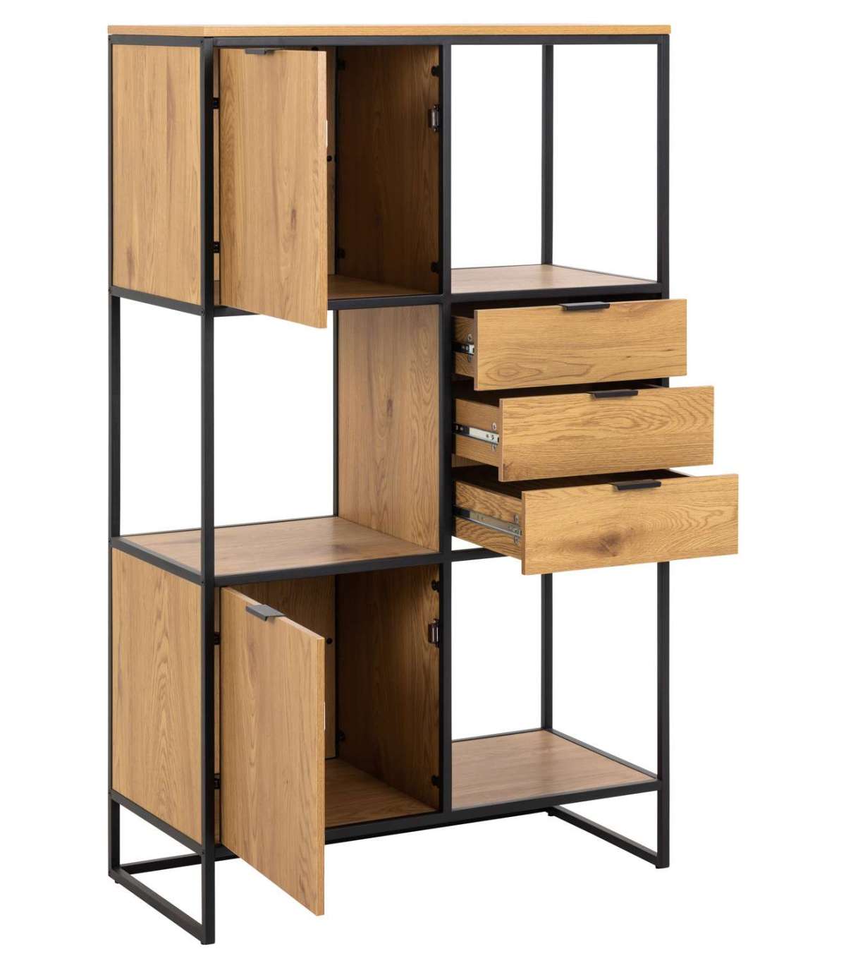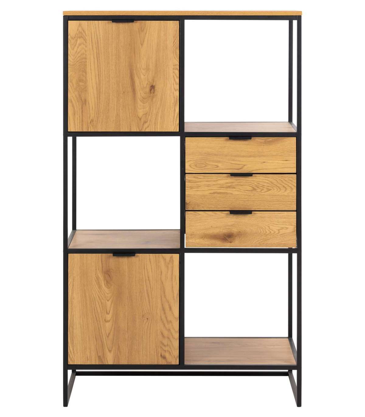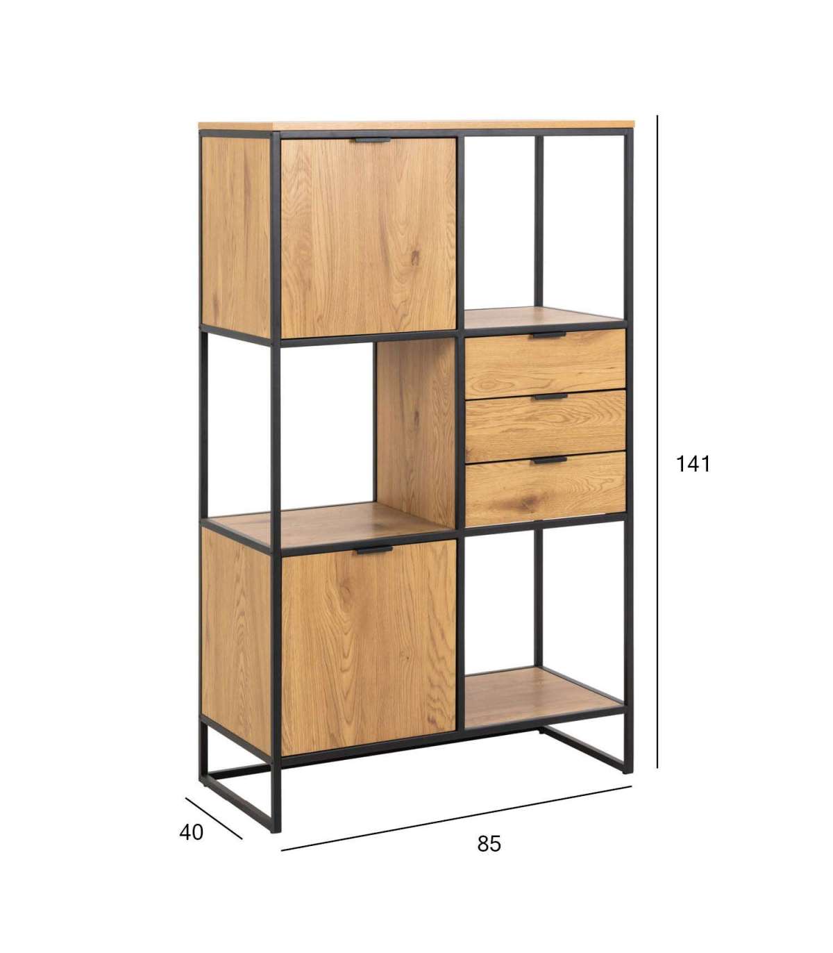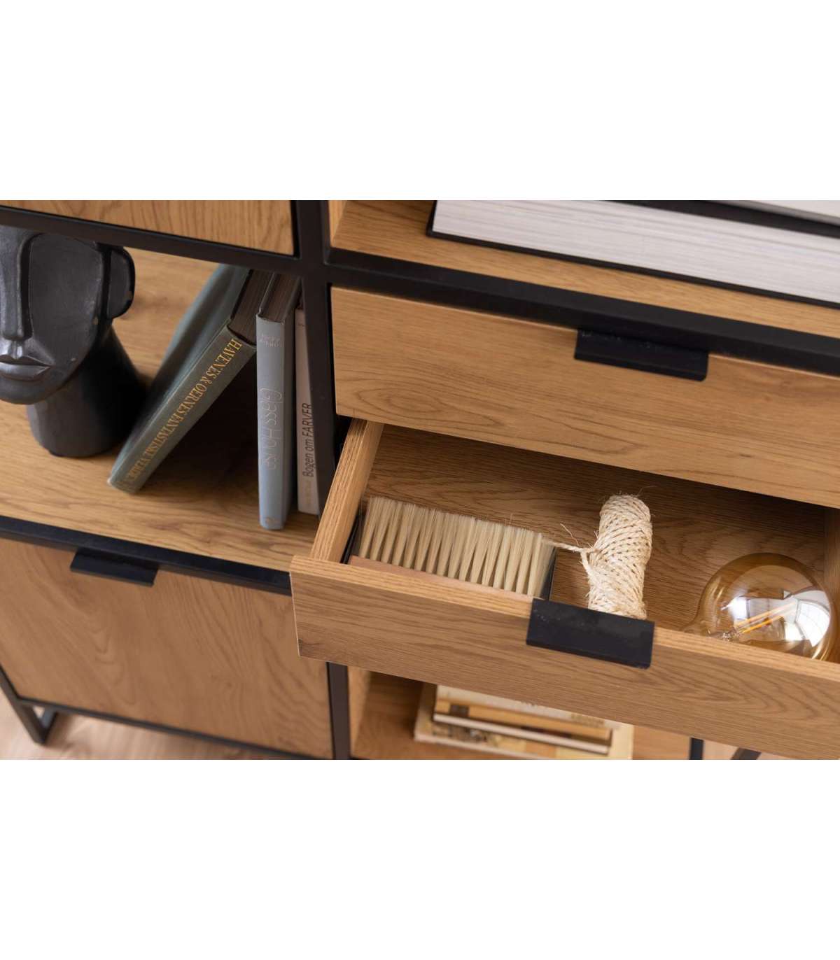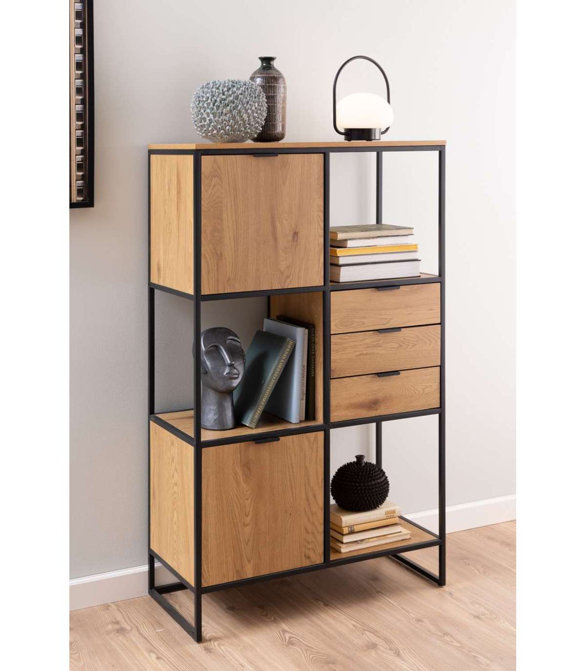 Moodne tamme välimusega raamaturiiul metallraamiga, mis sobib enamikesse kodudesse. Avatud ja suletud riiulid võimaldavad valida, milliseid esemeid eksponeerida ja mida mitte. Pulbervärvitud metallraam, melamiinpind. Sujuvalt sulguvad sahtlid. HOOLDUS: Kasutage seebivees tugevasti väänatud lappi ja pühkige pind kindlasti kuivaks. Vältige küürimispulbri või nailonkäsnade kasutamist, kuna need pleegitavad või kriimustavad materjali. Rooste vältimiseks pühkige raam lapiga kuivaks. Ärge hõõruge pinda kõvade esemetega.