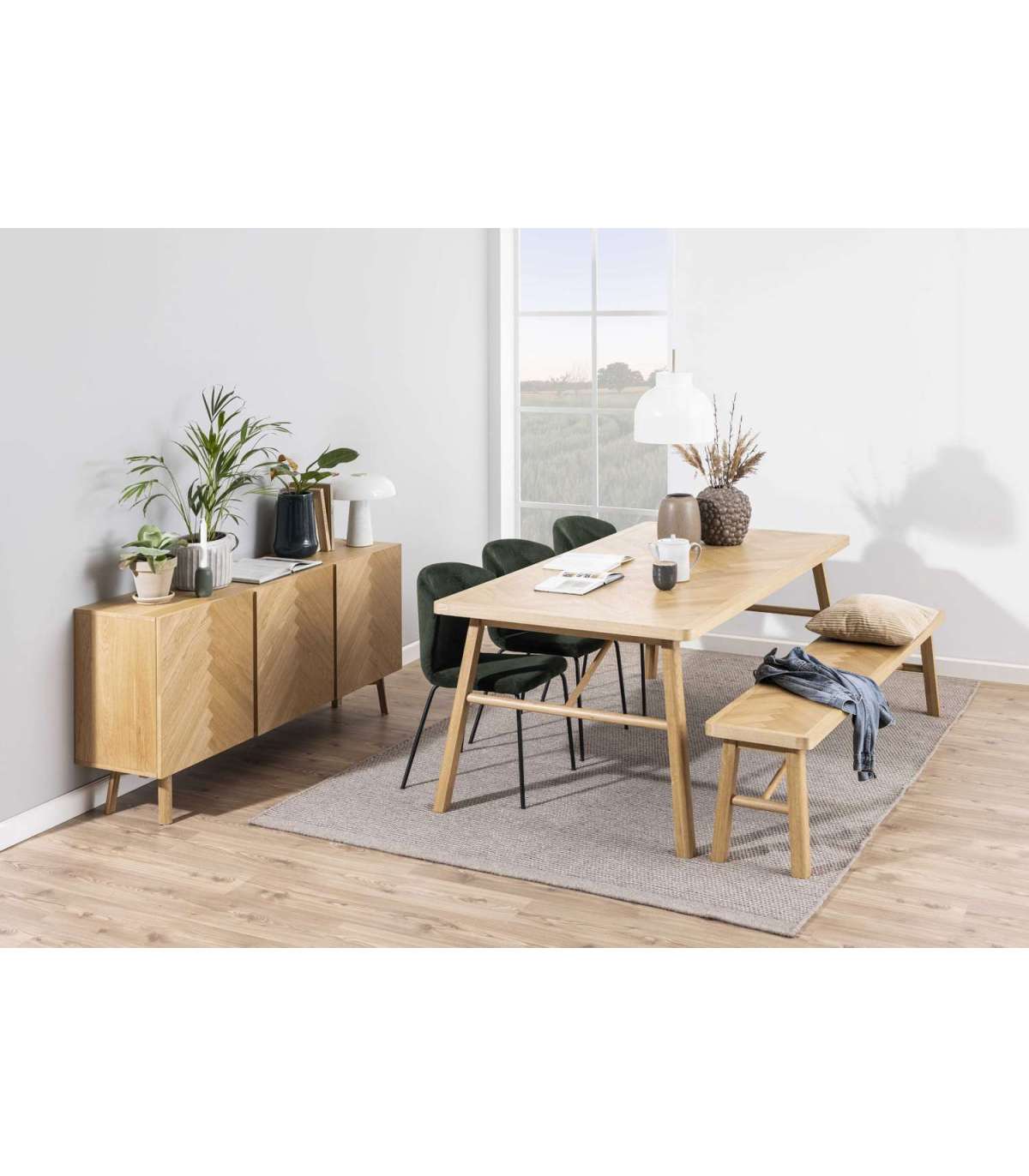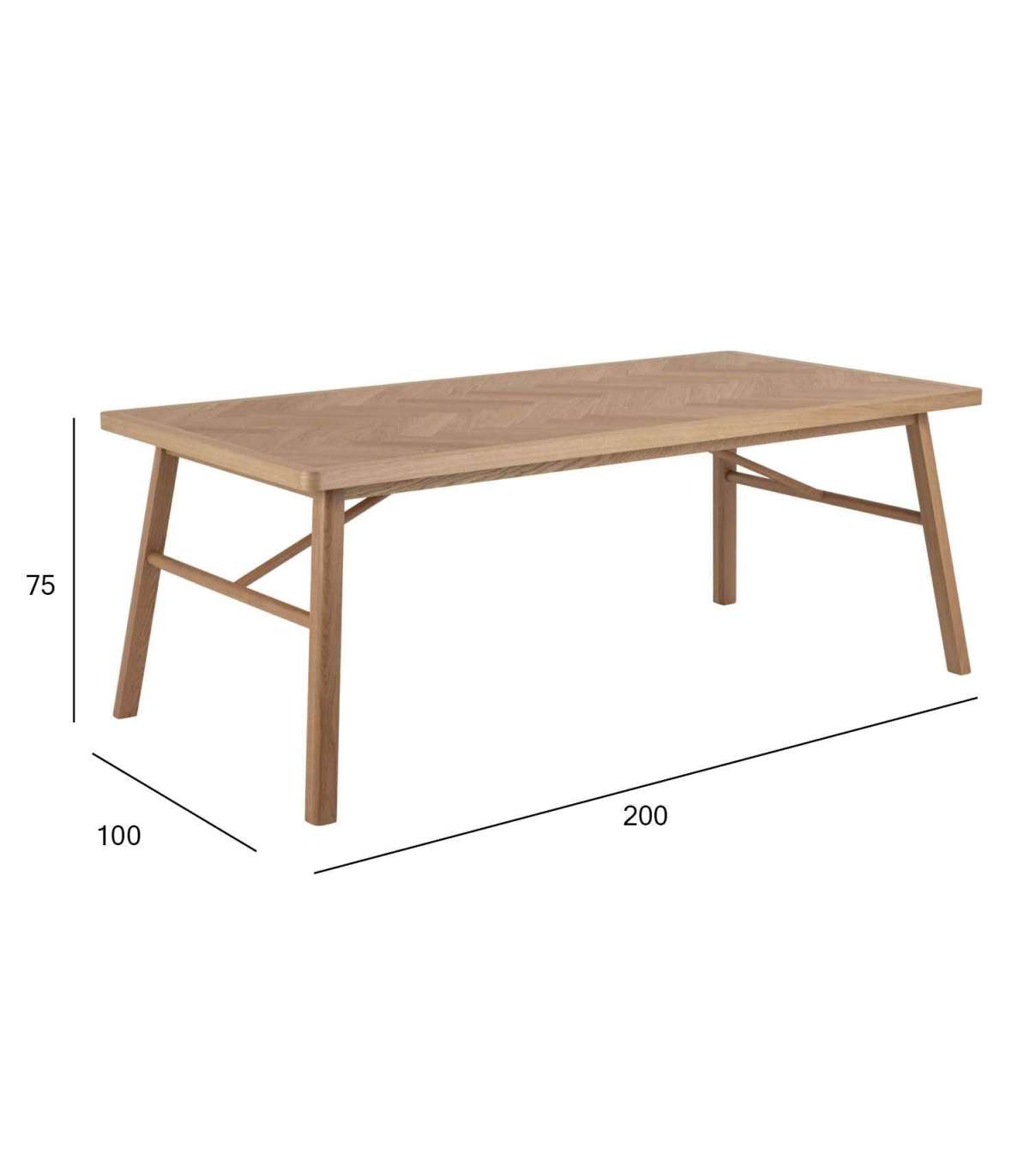Laual on silmapaistev kalasabamustriga lauaplaat. Laud on valmistatud tammepuidust ja tammespoonist. Mahutab mugavalt 6 inimest. Mõõdud on 200x100xH75cm. HOOLDUS: Lakitud pinnad vajavad vähe hooldust. Kõik plekid tuleb koheselt eemaldada seebivees väänatud lapiga ja pühkida kindlasti kuivaks. Klaasialused ja lauamatid aitavad vältida pinnakahjustusi.