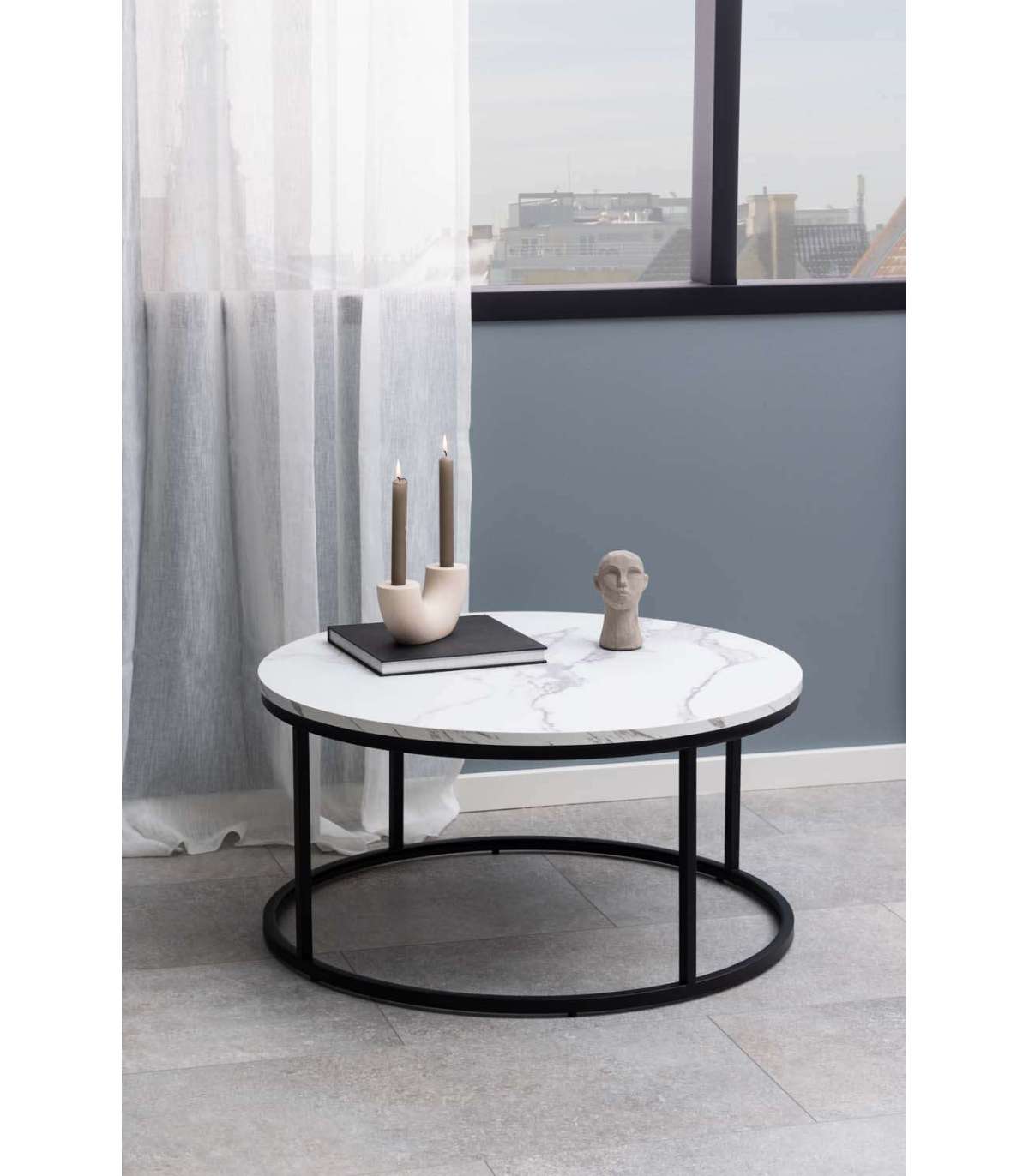 Omanäolise ümara lauaplaadi ja ümara alusega diivanilaud. Valge marmori välimus annab lauale kaasaegse ilme. Lauaplaat on valmistatud melamiinist. Koos musta pulbervärvitud metallalusega sobib laud enamikesse kodudesse. Mõõdud D80xH40cm.