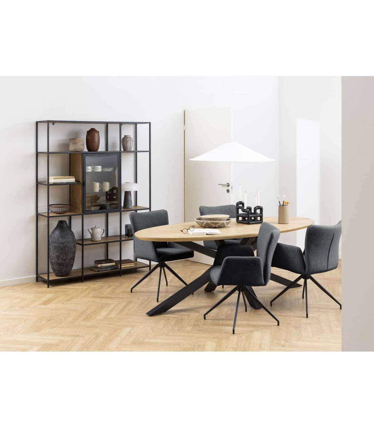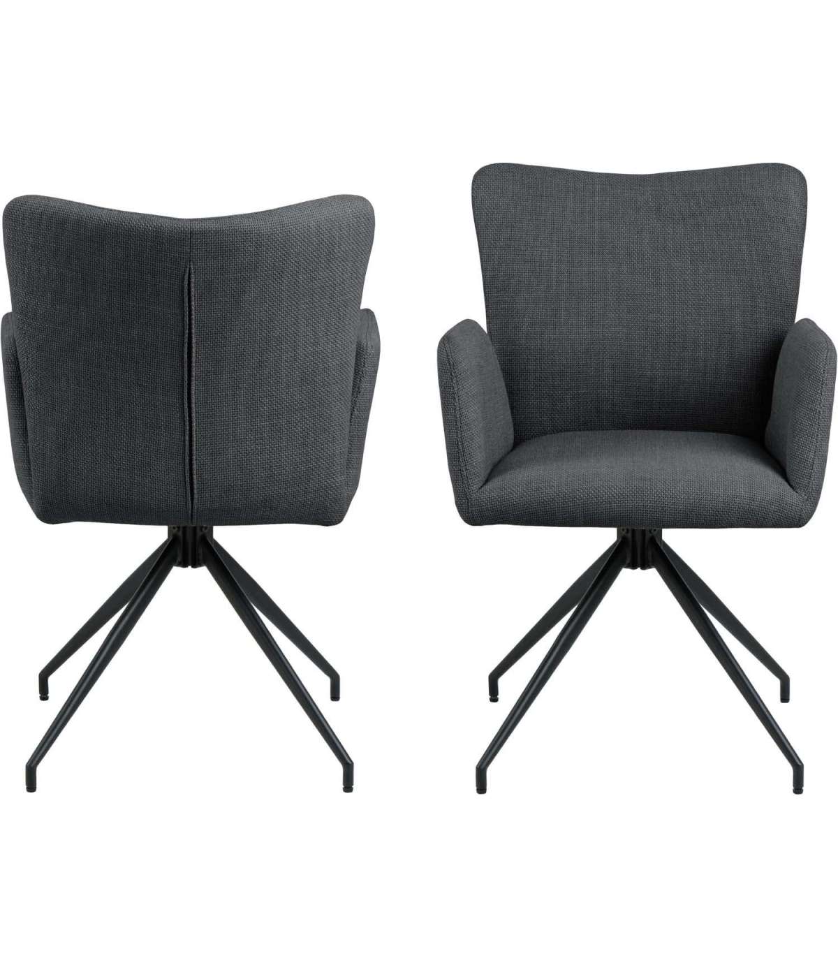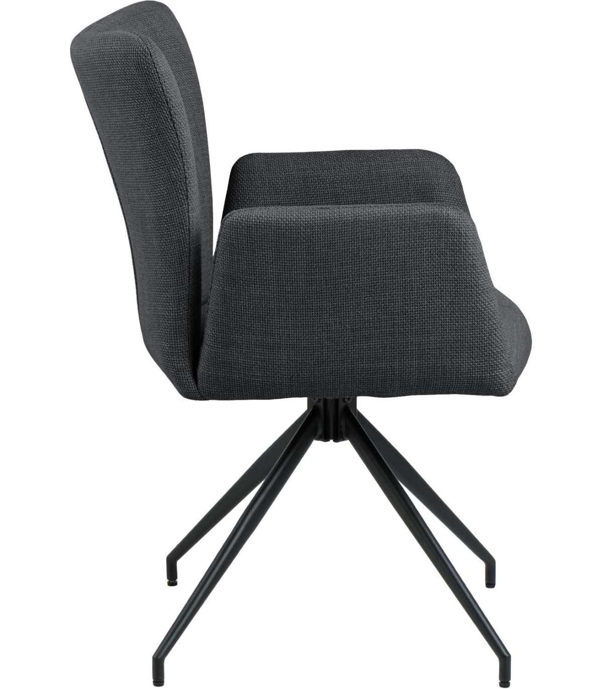 Stiilsel söögitoolil on elegantne siluett. Orgaanilise kujuga istmel on iseloomulikud lõiked seljatoe ja käetugede vahel, mis lisavad toolile stiilse nüansi. Tool on kaetud tumehalli kahevärvilise efektiga kangaga, mis annab tekstuuri ja sügavuse. Pöörleva funktsiooniga aluse abil saab tooli sujuvalt ja hõlpsalt pöörata. Tool sobib eriti hästi kaasaegsetesse söögitubadesse. Mõõdud on 57x61,5xH86cm.