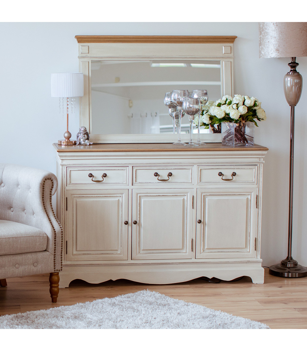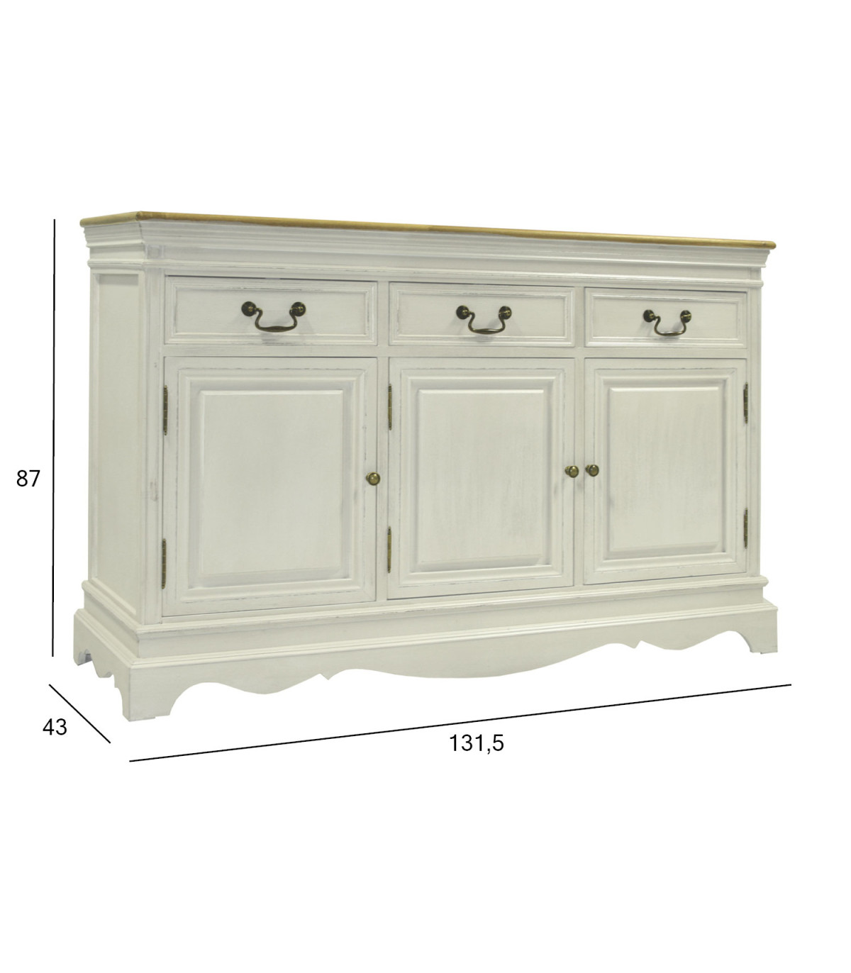 Комод SAMIRA с 3 дверьми и 3 ящиками, 131,5x43xH87см, антично-белый - натуральный. Дерево: ясень, павловния, обработка: лакированный.